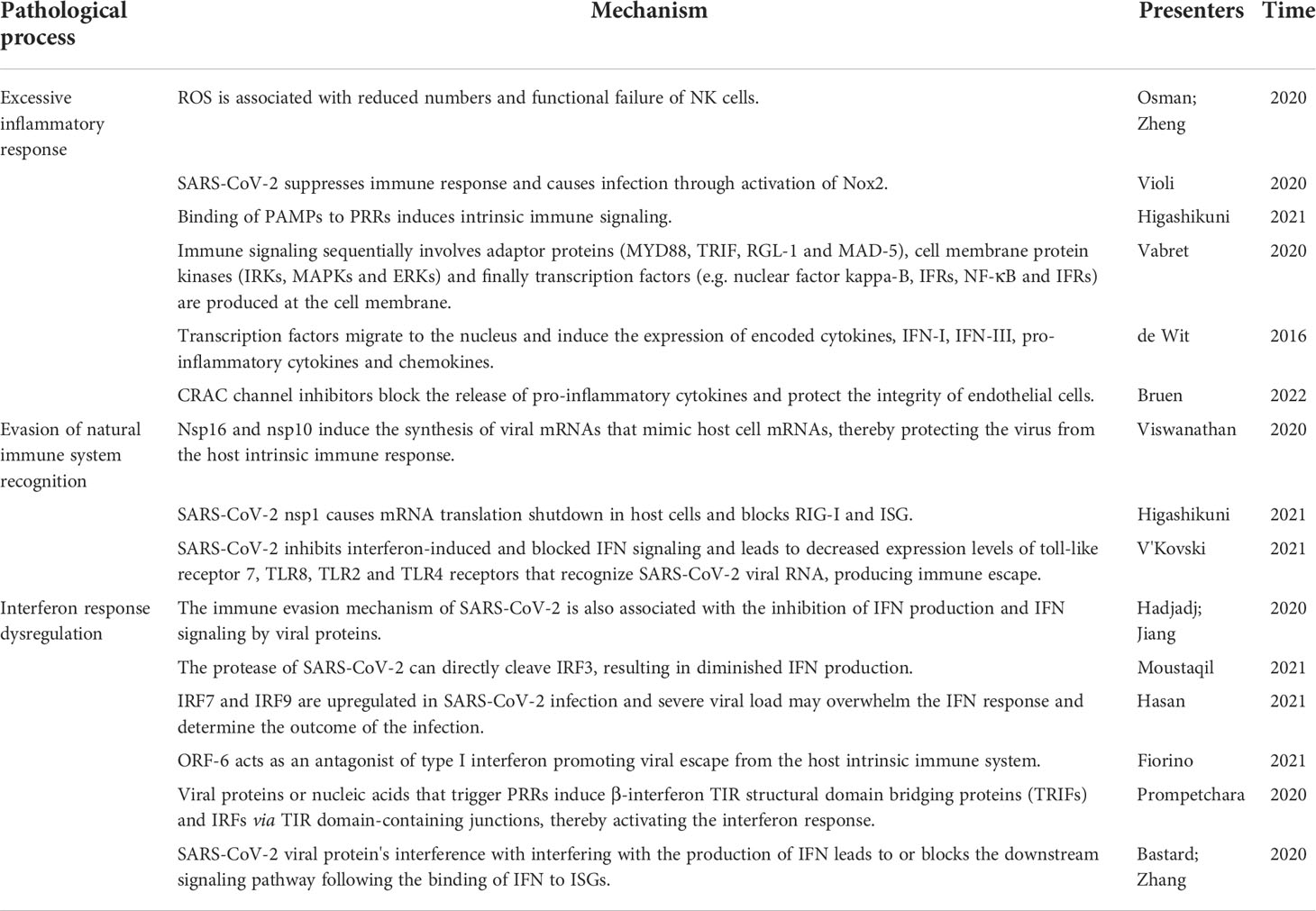 When normal, the body’s immune system can limit processes such as the entry of viruses into host cells and their replication within the host cells. The immune system has two main defense mechanisms: innate immunity and adaptive immunity. In contrast, after infection with the SARS-CoV-2 virus, the pathogen-associated molecular patterns (PAMPs) of the virus trigger specific combinations of pattern recognition receptors (PRRs) and adapter molecules, leading to an immune response adapted to the pathogen (67), resulting in abnormal immune response function and causing the associated pathological processes.