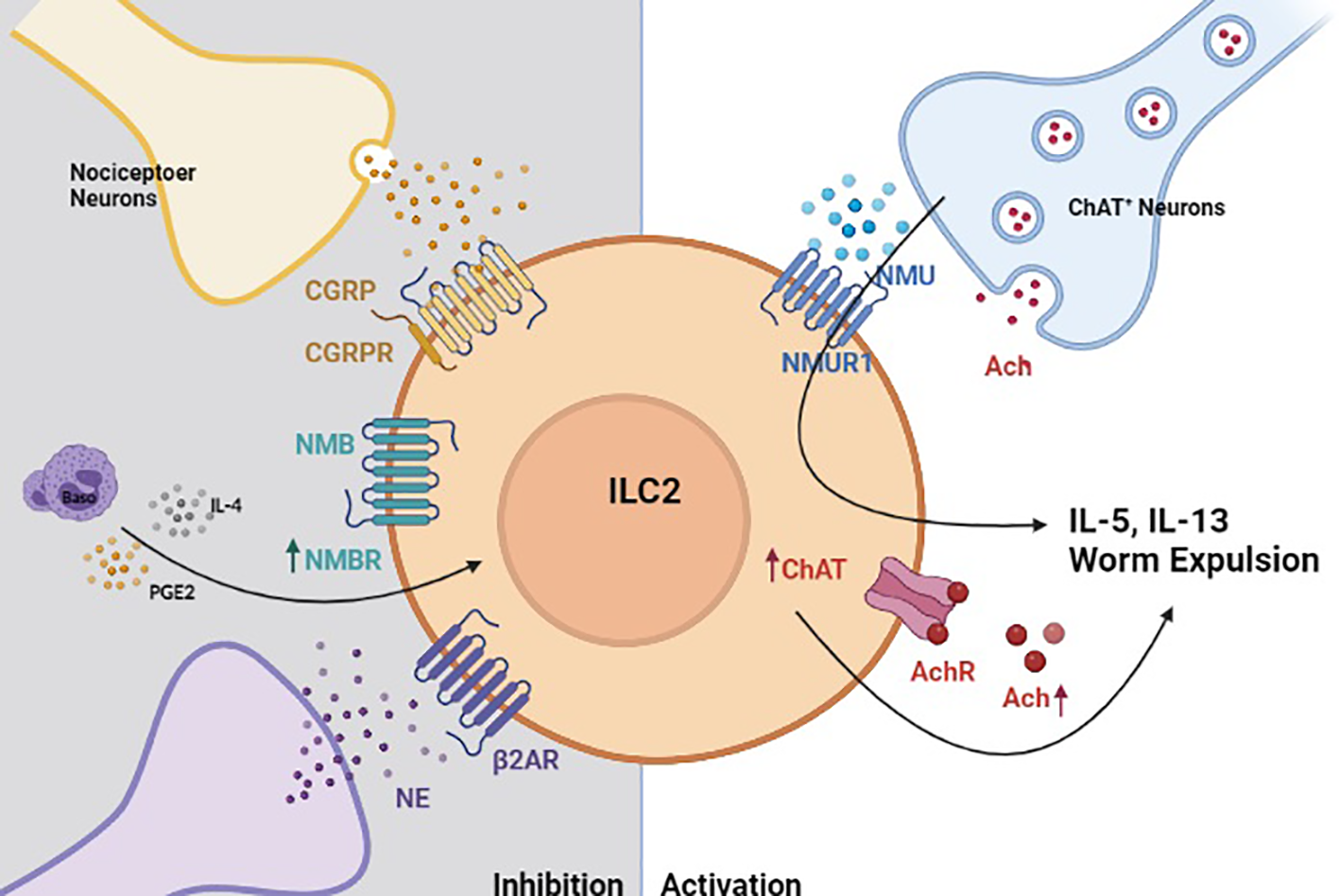 Neuro-Immune crosstalk regulates helminth-induced inflammation. In the context of helminth-induced inflammation, group 2 innate lymphoid cells (ILC2s) are activated by neuromedin U (NMU) that is released by choline acetyltransferase positive (ChAT+) neurons (185). Activated ILC2s also upregulate ChAT to promote acetylcholine biosynthesis, which serves to further amplify their production of type 2 cytokines (184). Helminth-activated ILC2s are also restricted by neuron-derived signals. Calcitonin gene-related peptide (CGRP), neuromedin B (NMB) and sympathetic neuron-derived norepinephrine (NE) inhibit ILC2 response in a manner that properly regulated helminth-induced inflammation (78, 182, 183).