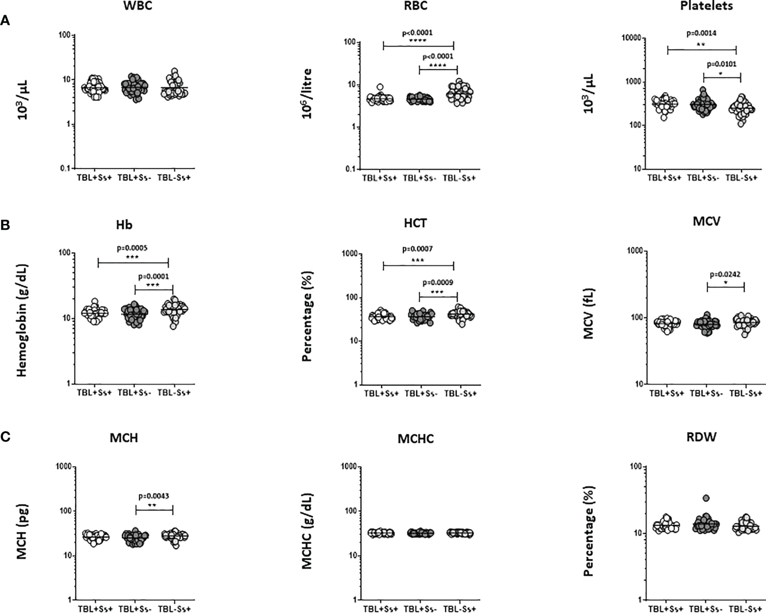 Altered hematological parameters of the population. We have analyzed different hematological (A) WBC, RBC, platelets (B) Hb, HCT, MCV (C) MCH, MCHC, RDW) parameters in TBL+Ss+ (n=44), TBL+Ss- (n=44) and TBL-Ss+ (n=44) groups using the AcT5 Diff hematology analyzer (Beckman Coulter). We used Kruskal-Walli’s test with Dunn’s multiple comparisons to measure the statistical P values. The significance of p values was represented as '*' p<0.05, '**' p<0.01, '***' p<0.001, '****' p<0.0001.
