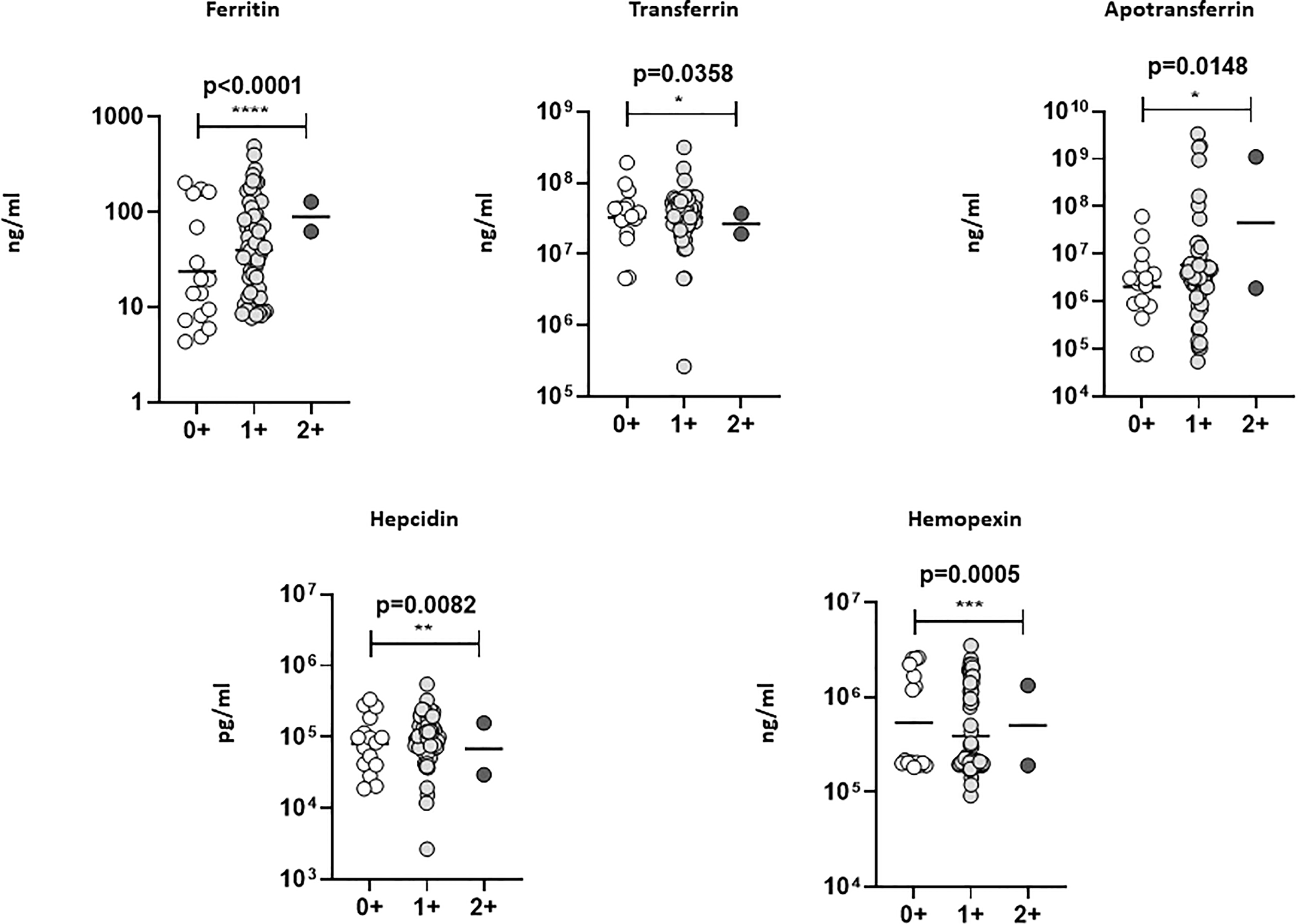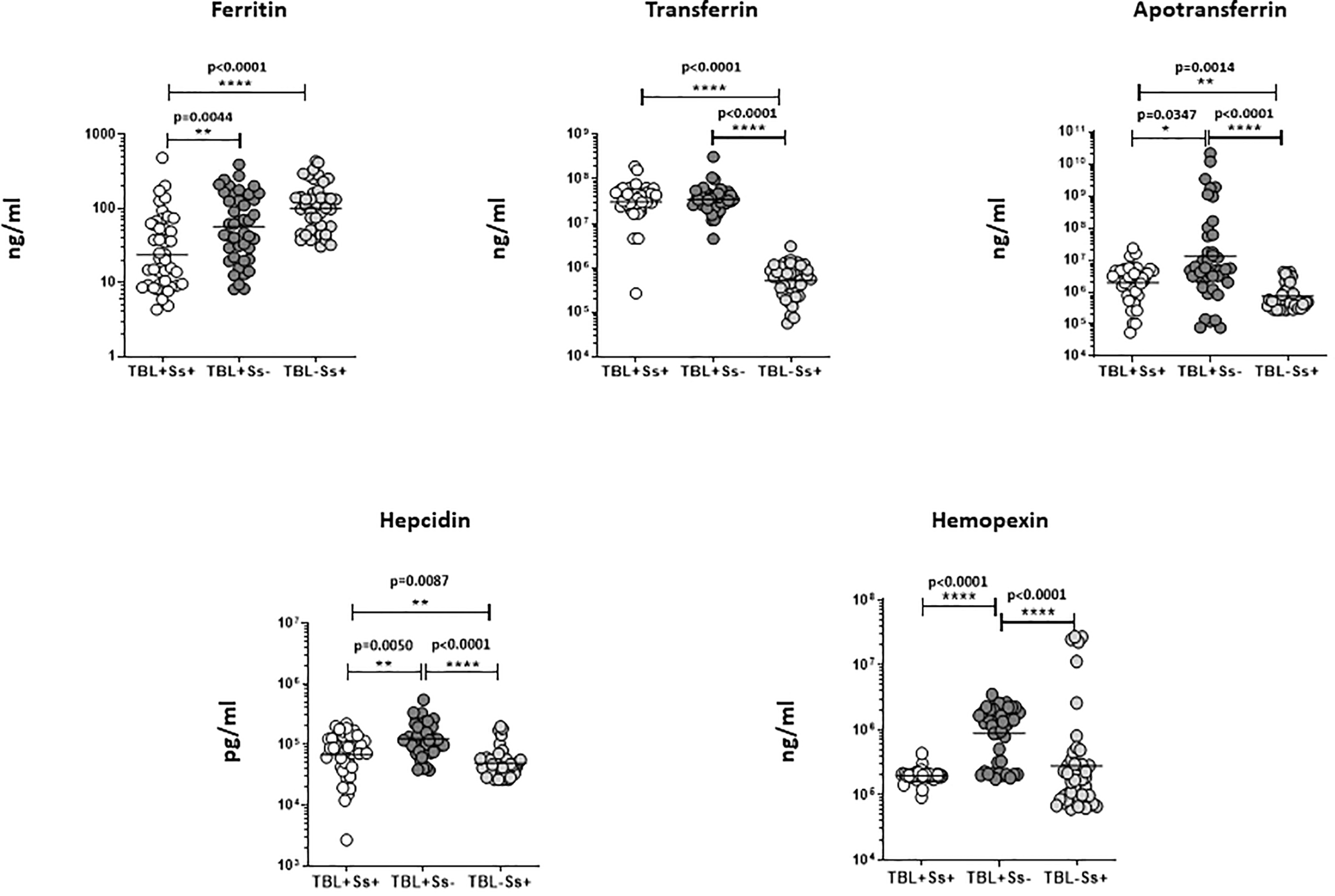 Iron status biomarker plasma levels in TBL+ (Ss+, Ss-) and TBL-Ss+ groups. We have measured the iron status (ferritin, transferrin [TF], apotransferrin [ApoT], hepcidin, hemopexin) biomarker systemic levels in TBL+ (Ss+, n=44), (Ss-, n=44) and TBL-Ss+ (n=44) groups by ELISA. We showed the figures using scatter plots with an individual circle denoting a single participant. We used Kruskal-Wallis Dunn’s multiple comparisons test to measure the statistical P values. The significance of p values was represented as '*' p<0.05, '**' p<0.01, '****' p<0.0001.