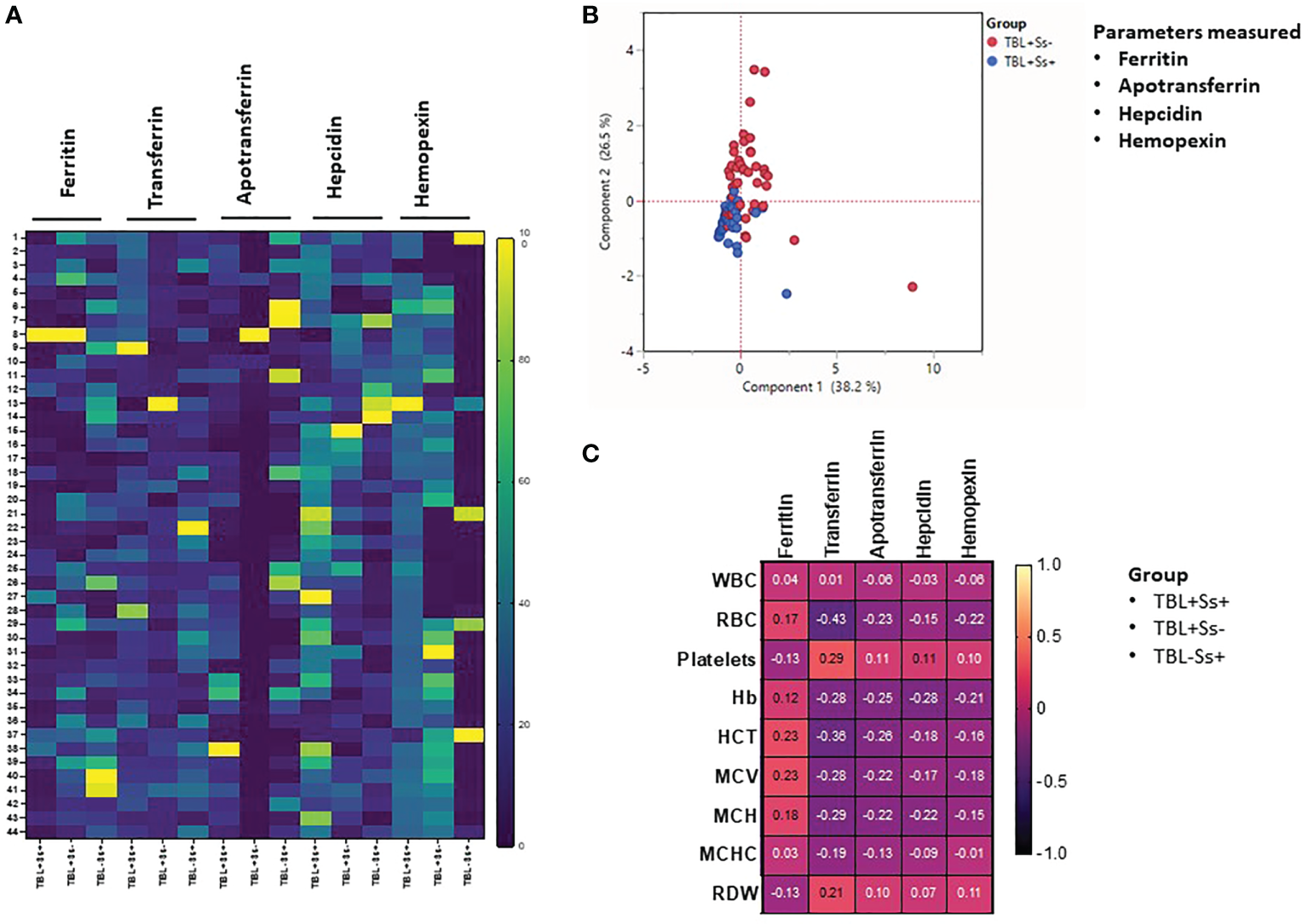 Heatmap, principal component analysis (PCA) and correlation analysis of iron status biomarkers. (A) Heatmap analysis of iron status (ferritin, TF, ApoT, hepcidin, hemopexin) biomarkers was performed between TBL+Ss+ (n=44), TBL+Ss- (n=44) and TBL-Ss+ (n=44) individuals. (B) PCA analysis of iron status (ferritin, transferrin [TF], apotransferrin [ApoT], hepcidin, hemopexin) biomarkers was carried out between TBL+Ss+ (n=44, blue circle) and TBL+Ss- (n=44, red circle) to examine the cluster pattern between component 1 versus component 2. (C) Correlation ability of iron status (ferritin, transferrin [TF], apotransferrin [ApoT], hepcidin, hemopexin) biomarkers and hematological (WBC, RBC, platelets, Hb, HCT, MCV, MCH, MCHC, RDW) parameters between TBL+Ss+ (n=44), TBL+Ss- (n=44) and TBL-Ss+ (n=44) individuals.