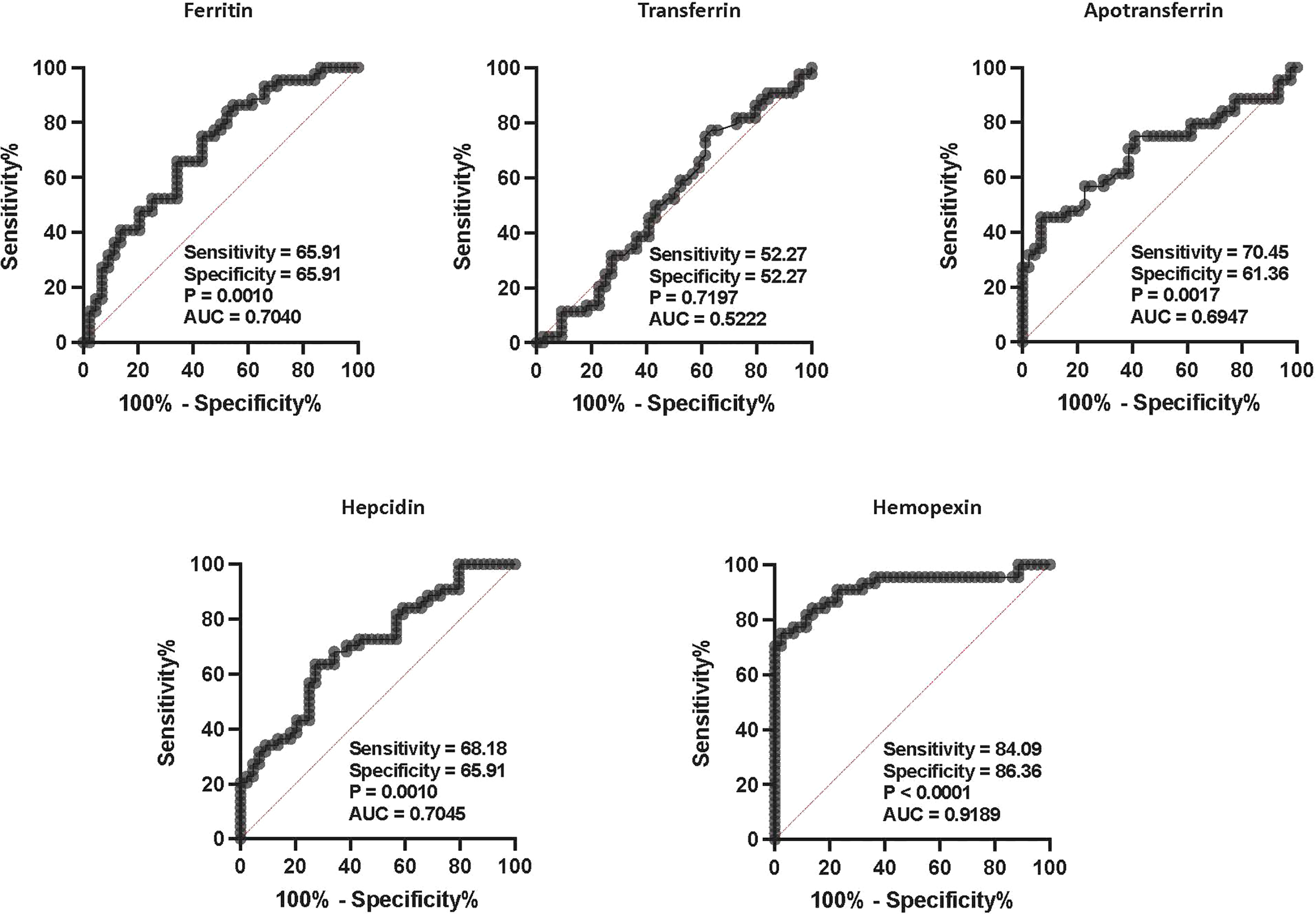 ROC analysis of iron status biomarkers. ROC analysis of iron status (ferritin, TF, ApoT, hepcidin, hemopexin) biomarkers in TBL+ (Ss+, n=44 and Ss-, n=44) groups was performed to evaluate the sensitivity, specificity, and area under the curve.