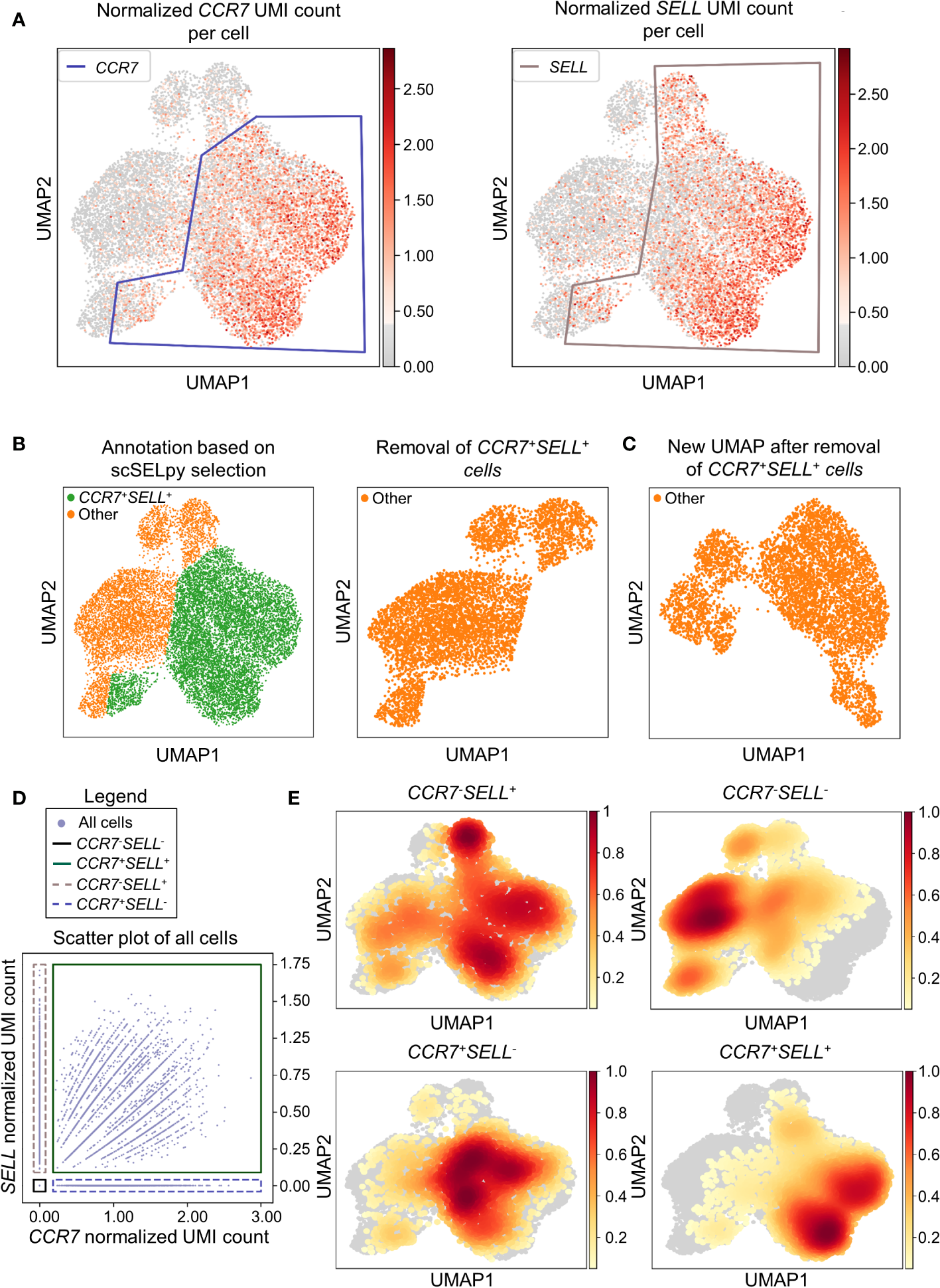 Figure 2 Selection and removal of central memory T cells from the dataset using scSELpy to obtain effector memory T cells. (A) Selection of regions enriched for cells expressing CCR7 and SELL (CD62L, L-Selectin) on UMAP plots. (B) Identification and removal of the cells located in both the CCR7 and SELL polygon as selected in A (green). (C) Re-analysis of the remaining cells from raw data. Normalization and UMAP dimension reduction is performed anew. (D) Scatter plot of all cells from the dataset with normalized CCR7 and SELL expression on the x-axis and y-axis, respectively. On this scatter plot, scSELpy was employed to categorize cells with or without expression of CCR7 and/or SELL. (E) UMAP density plots highlighting the cells belonging to the categories created in (D). The parameter “vmin” to control the lower limit in the color scale was set to 0.05.