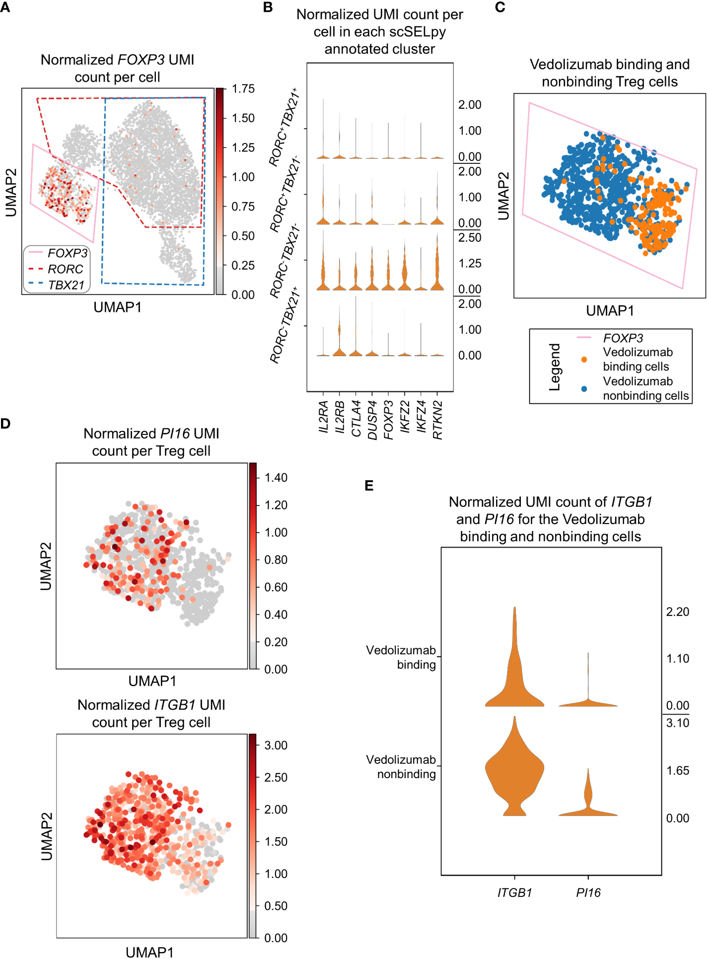 Figure 4 Selection and analysis of regulatory T cells with scSELpy. (A) Selection of the region enriched for FOXP3 expression, using the UMAP representation presented in Figure 2C. The selections for RORC and TBX21 from Figure 3A are marked with dotted lines. (B) Violin plots of the expression of eight genes associated with Tregs in the four regions determined based on TBX21 and RORC expression. (C) Depiction of cells binding vedolizumab or not as determined by FACS sorting prior to sequencing on the population selected in (A). (D) Expression of ITGB1 and PI16 in the cell population selected in (A). (E) Stacked violin plot of PI16 and ITGB1 expression for Vedolizumab-binding cells and cells that do not bind Vedolizumab.