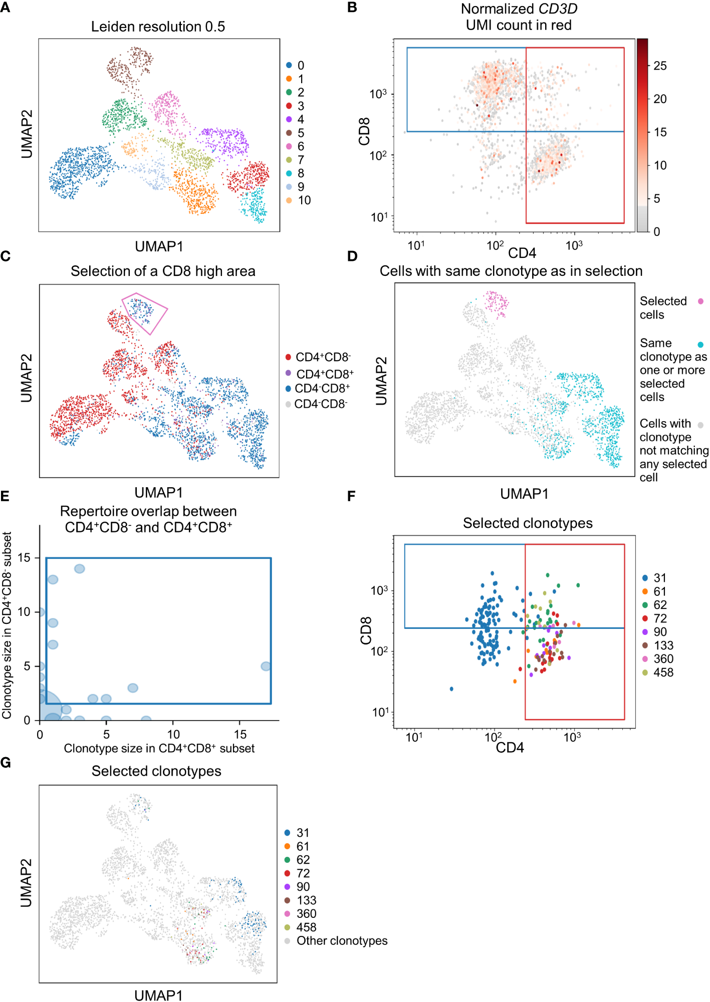 Figure 5 Applying scSELpy on T cell receptor (TCR) sequencing and antibody capture data. The single cell RNA sequencing data of PBMCs in blood from patients treated with Immune checkpoint inhibitors was retrieved from GSM6346300. Only cells, for which a TCR is detected are used in these plots. (A) UMAP plot of the cells; clusters are defined by leiden with a resolution of 0.5. (B) Scatter plot with the detected CD4 and CD8 antibody UMIs on the x-axis and y-axis, respectively. Gates set with scSELpy split the data up into CD4+CD8+ double positive cells, single positive CD4+CD8- cells, single positive CD4-CD8+ cells and CD4-CD8- double negative cells. The CD3D mRNA derived UMI count is highlighted in red. (C) Visualization of the four groups defined in (A) on the UMAP plot. A group of cells is selected with scSELpy. (D) UMAP representation of T cells selected in (C) (magenta) together with all other T cells also expressing one of the TCRs present in the selection (blue). Cells colored in grey do not have a clonotype that matches a T cell in the selected region. (E) TCR repertoire of CD4+CD8- cells plotted against TCR repertoire of CD4+CD8+ cells for each clone ID using Scirpy. Clone IDs that are present in both cell populations were selected using scSELpy. (F) Mapping of the cells selected in (E) on the scatter plot of CD4 and CD8 antibody UMIs with the gates kept as in (B). (G) UMAP representation of the T cells selected in (E).