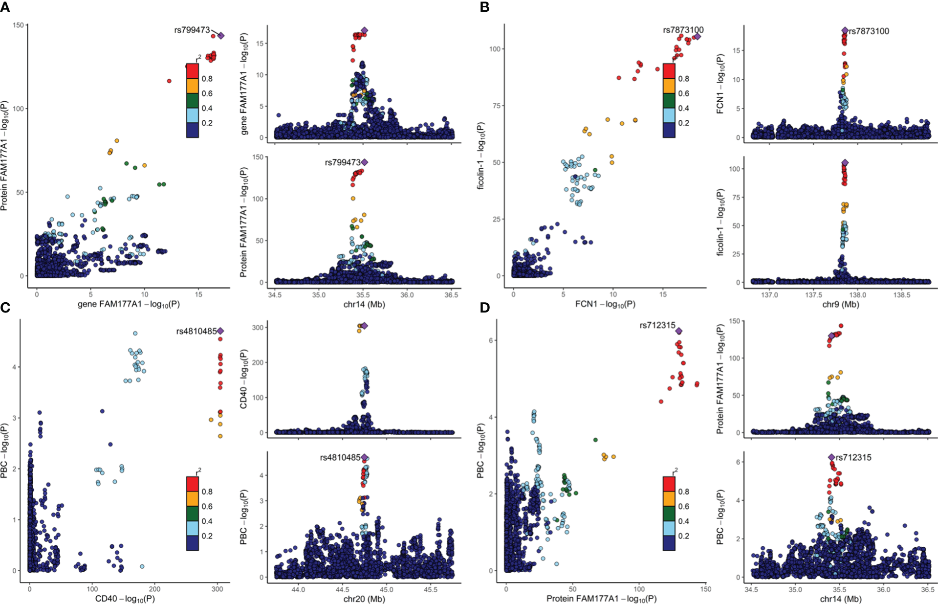 The colocalization results are visualized in Figure 2. The lead SNP is indicated by the purple diamond. Strong evidence of colocalization was shown. The plots on the right show the causal variant of two traits from the same locus. The -log P values of two traits from a single locus are plotted on the left. (A) Colocalization analysis of eQTLs for gene FAM177A1 and pQTLs for protein FAM177A1. (B) Colocalization analysis of eQTLs for gene FCN1 and pQTLs for ficolin-1. (C) Colocalization analysis for pQTLs of CD40 and PBC. (D) Colocalization analysis of pQTLs for protein FAM177A1 and PBC.