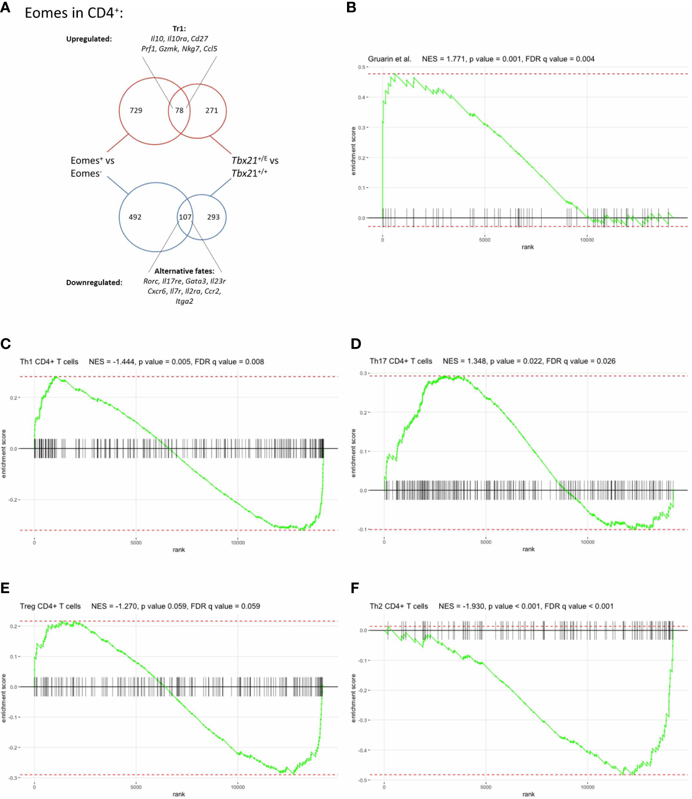 Eomes governs a distinct transcriptional profile in CD4+ T cells. (A) Comparison of Eomes-specific gene set with Roessner et al. (11) DEGs of Tbx21+/+ vs Tbx21+/E were compared with the DEGs of Roessner et al. Eomes+ vs Eomes- CD4+ T cells after expansion in Rag2-/- mice. Of the 78 up- and 107 downregulated genes differentially expressed in both studies selected genes are shown (Full list in Supplementary Table 5). (B-E) GSEA of T helper cell subset gene signatures compared with differences in gene expression between CD4+ SMARTA T cells from Tbx21+/E and Tbx21+/+, (B) a set of genes upregulated in human IL-10-secreting IL-7r- CD4+ T cells, derived from Gruarin et al. (10), (C-F) sets of upregulated genes in (C) Th1, (D) Th17, (E) Treg and (F) Th2 CD4+ T cells, as detailed in the text. The enrichment score (ES) is shown on the y-axis and the x-axis represents the sorted list of genes in our comparison. Genes that are present in the respective gene set are shown by vertical black lines.