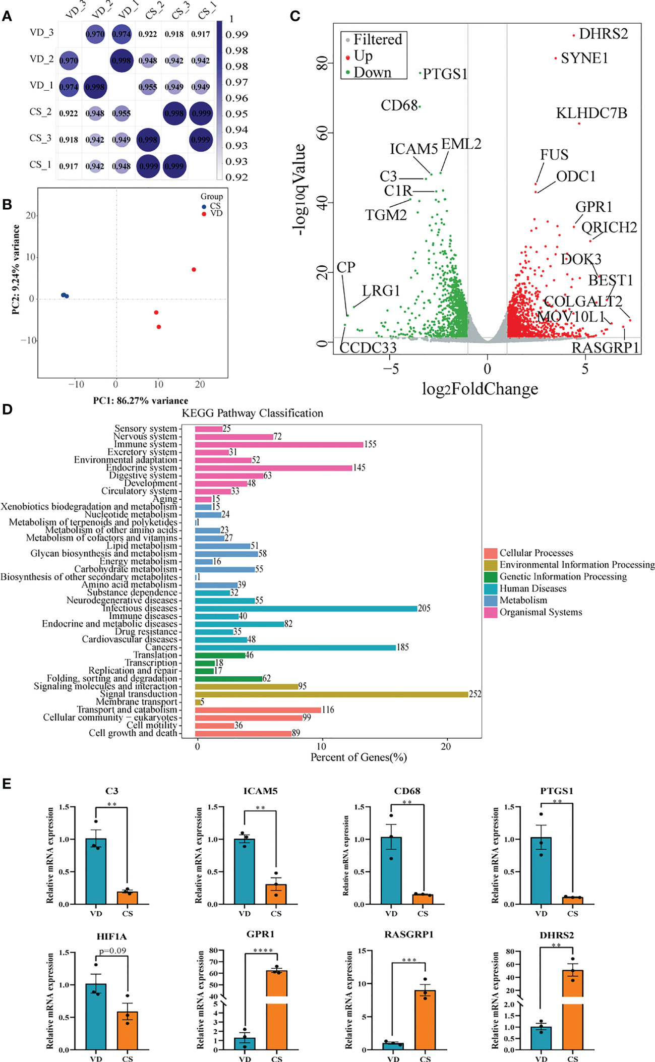 Figure 5 Transcriptome analyses of human intestinal epithelial NCM460 cells after CS AF stimuli. (A), Correlation heatmap analysis between CS AF-treated cells (n = 3) and VD AF-treated cells (n = 3). (B), PCA score plots for differentiating the genes in each group. (C), Volcano plot showing the differentially expressed genes (DEGs) in the CS AF-treated group (n = 3) and VD AF-treated cells (n = 3). Red dots represent the DEGs up-regulated in the CS AF-treated cells, and green dots represent the DEGs down-regulated in the CS AF-treated cells. (D), KEGG classification analysis of DEGs. (E), Validation of DEGs between CS AF-treated group (n = 3) and VD AF-treated group (n = 3) using RT-qPCR. The change in fold-expression was calculated by the 2-∆∆CT method using GAPDH as a reference gene. Error bars represent SEM. **p < 0.01, ***p < 0.001, ****p < 0.0001.