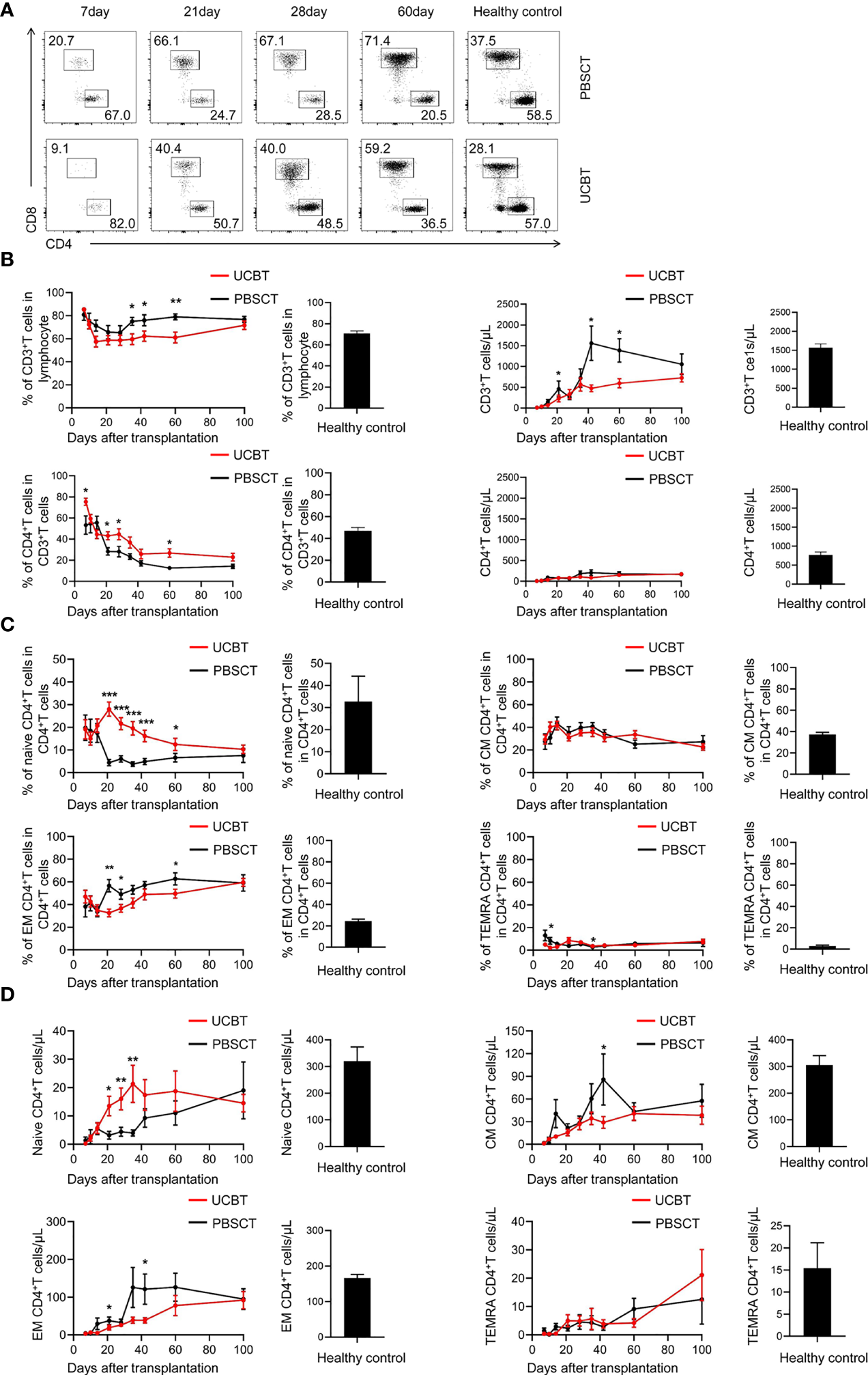 The expansion of CD4+ T cell subpopulations during the initial stages after UCBT or PBSCT. (A-D) Flow cytometry analysis of the peripheral blood mononuclear cells (PBMCs) in the UCBT and PBSCT group on days 7, 10, 14, 21, 28, 35, 42, 60, and 100 after HSCT. (A) Representative flow cytometry dot plots and the frequencies (percentages) of CD4+ T cells and CD8+ T cells during the early posttransplant period (day 7 to day 100) after UCBT and PBSCT. (B) The frequencies and the numbers of CD3+ T cells and CD4+ T cells during the early posttransplant period after UCBT and PBSCT. (C) The frequencies and (D) numbers of naïve CD4+ T cells, central memory CD4+ T cells, effector memory CD4+ T cells and terminally differentiated effector memory CD4+ T cells during the early posttransplant period after UCBT and PBSCT. The histogram shows data for the healthy control group. CM, central memory; EM, effector memory; TEMRA, terminally differentiated effector memory. The data was analyzed by the Mann–Whitney U test and represented as means ± standard error of the mean (SEM). *p < 0.05; **p < 0.01; ***p < 0.001.