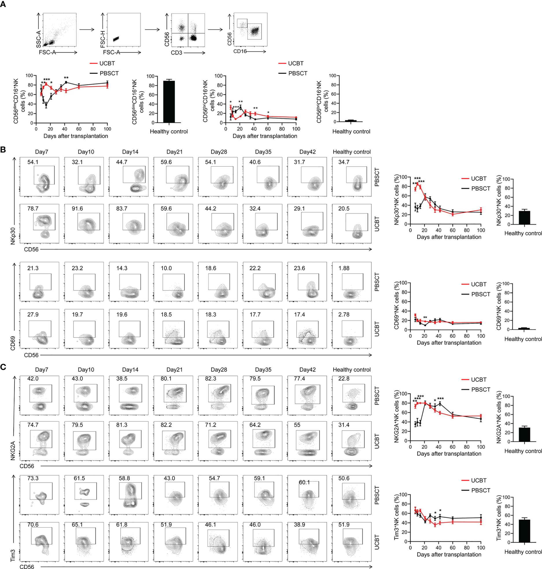The dynamic changes in the NK cell subpopulations and the expression levels of immune-activating molecules on the NK cells. (A) The frequencies of NK cell subpopulations during the early posttransplant period after UCBT and PBSCT. Representative flow cytometry contour plots and the dynamic changes in the expression levels of (B) NKp30, CD69, (C) NKG2A and Tim3 in the gated NK cells during the early posttransplant period after UCBT and PBSCT. The histogram shows data for the healthy control group. The data was analyzed by the Mann–Whitney U test and represented as means ± SEM. *p < 0.05; **p < 0.01; ***p < 0.001.