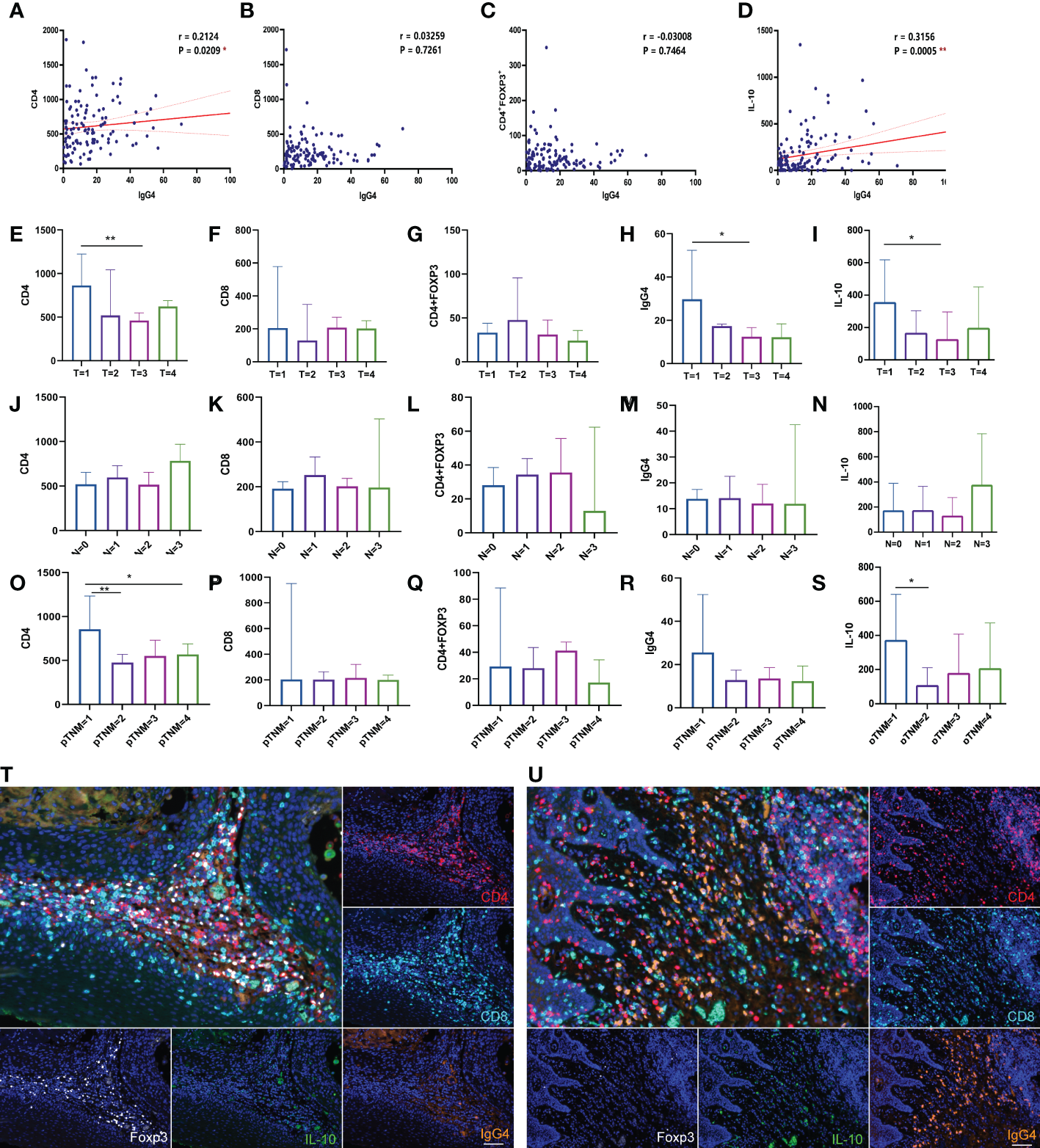 (A–D) Correlation analysis of IgG4, with CD4, CD8, Foxp3 and IL-10 positive cells (n=118). (E–S) Comparison of CD4, CD8, Treg, IgG4 and IL-10 in different T stages, N stages, pTNM stages (n=118). (T, U) The two figures show the typical multicolor immunofluorescence staining image located at high Foxp3 or IgG4 positive cells expressing area. Scale bar=60 μm. *p<0.05, **p<0.01.