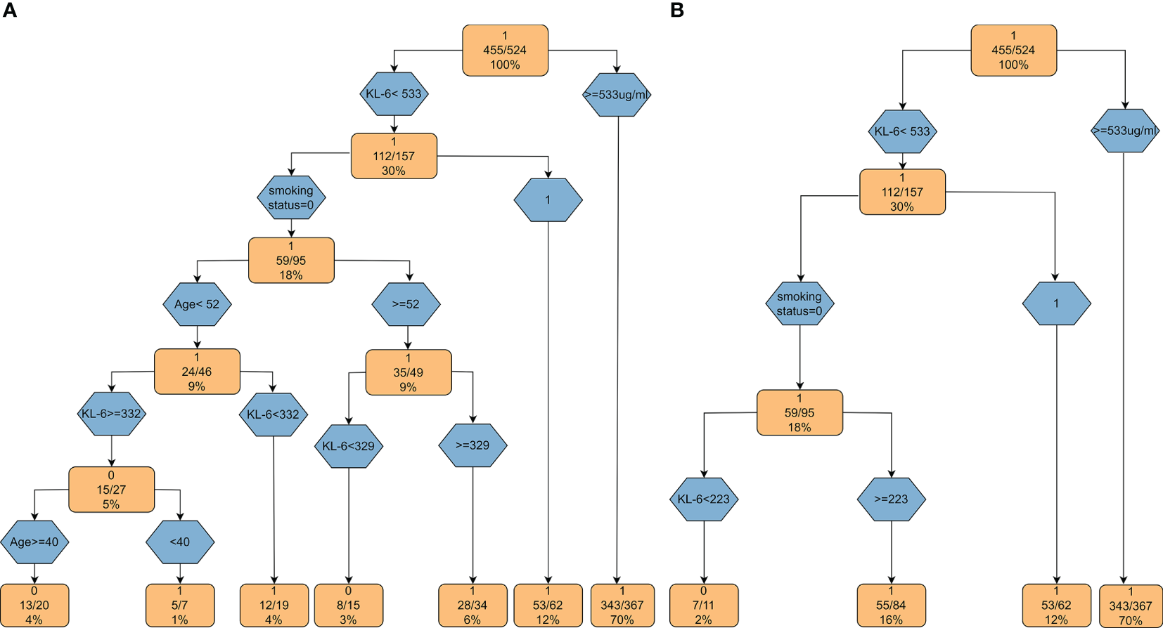 As such, we performed this retrospective study to determine the potential confounding factors related to KL-6 levels and to re-identify the role of KL-6 among patients with CTD-ILD after adjusting for confounders. Most importantly, we constructed a decision tree model to predict the incidence of ILD.