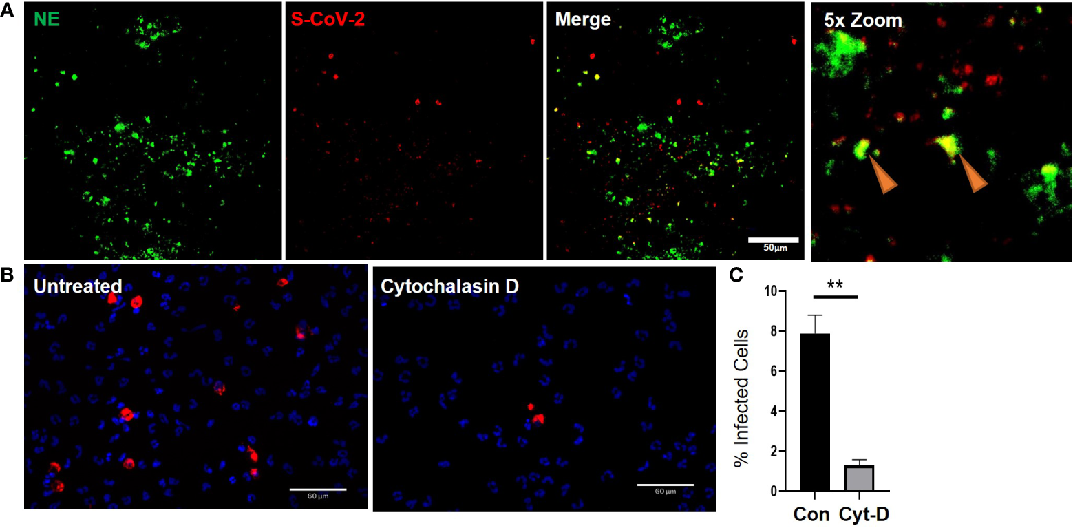 CD15+ neutrophils were seeded at 20,000 cells per well in in HBSS with or without 15 μM Cytochalasin D (Sigma Aldrich) black walled 96 well plates (Thermo Fisher Scientific) for 1 hour to allow for attachment. Cells were then infected with SARS-CoV-2 at 2 MOI (80 μl at 5x10^5 PFU/ml) for 4 hours. Cells were then washed 2 x with PBS and fixed in 4% PFA. Cells were stained for SARS-CoV-2 RNA via RNAScope and DAPI as per the manufacturer’s instructions. Whole wells were supplemented with 50 μl of PBS post staining and well were scanned on the DMi8 fluorescent microscope (Leica, Buffalo Grove, IL). Total cell number was determined by total frequency of DAPI particles and infected cells determined by SARS-CoV-2 particle signal in proximity to DAPI. Images were analyzed with ImageJ software 1.52n (National Institute of Health, Bethesda, MD).