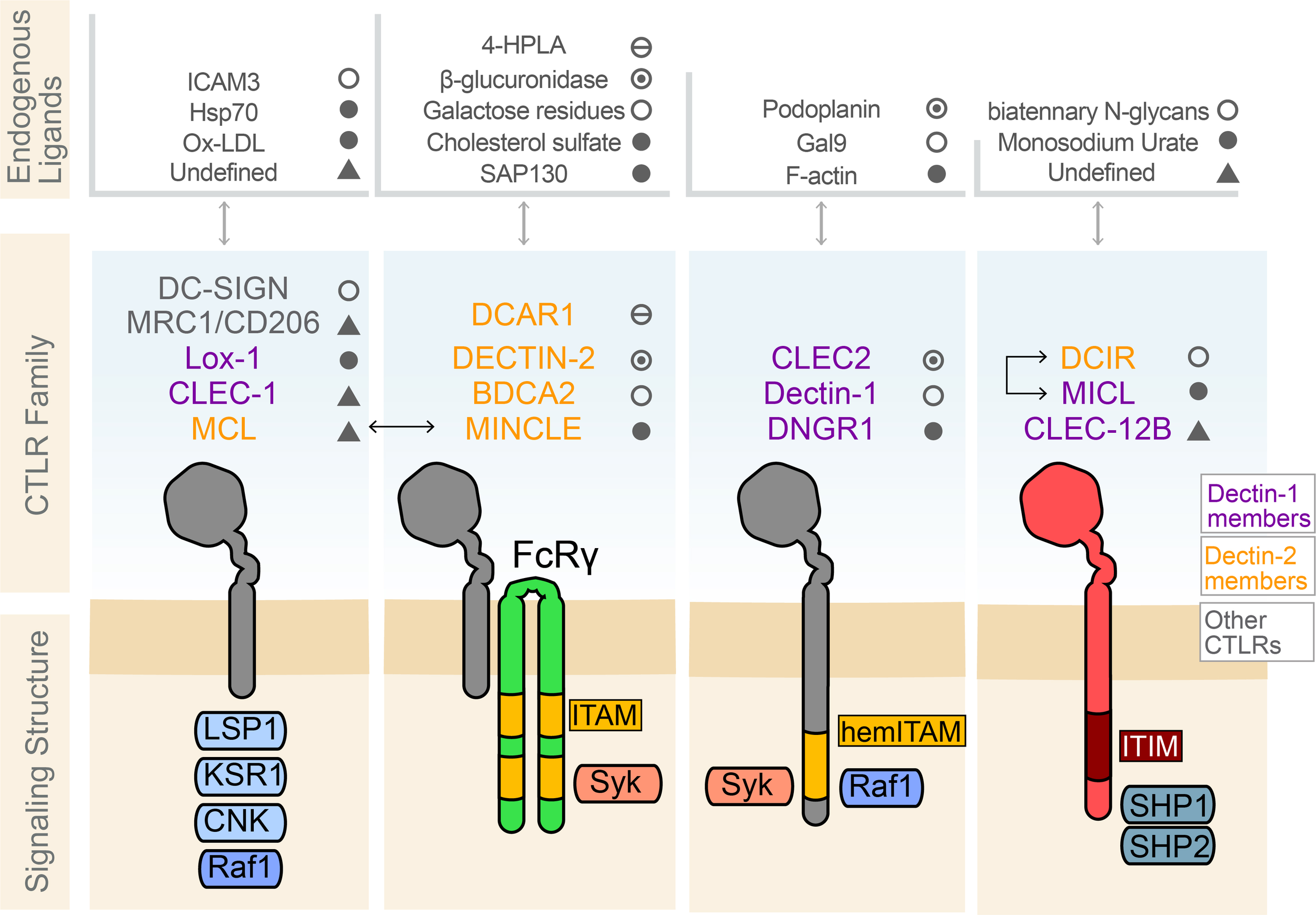 Select C-type lectin-like receptors, their known endogenous ligands, and their signaling structure. Several common CTLRs protein signaling structures are shared across the C-type lectins, including those within the Dectin-1 and Dectin-2 clusters. These include the CTLRs in which recognizable cytoplasmic signaling motifs are absent, such as DC-SIGN, Mannose Receptors (MRC1), LOX-1, CLEC-1, and MCL. The CTLRs DCAR1, DECTIN-2, BDCA2 in humans, and MINCLE, dimerize with ITAM-containing FcRg to initiate Syk kinase recruitment to trigger downstream signaling cascades. MCL and MINCLE, dimerize with FcRγ to take advantage of the ITAM present on the FcRγ receptor for signaling. CTLRs such as CLEC2, Dectin-1, and DNGR1 contain a hemITAM to signal. Dectin-1 contains domains for signaling through Raf-1 to mediated signaling involved in phagocytosis. MICL, DCIR, and CLEC-12B bear ITIM domains on their cytoplasmic tails which are known to recruit src-homology containing phosphatase 1/2 (SHP1/2). These phosphatases then play a role in signal modulation by dephosphorylating Syk or the further downstream activating factor NF-κB. MICL and DCIR heterodimerization have been shown to mediate this inhibitory signaling. Examples of the endogenous ligands known for some of these CTLRs are specified.