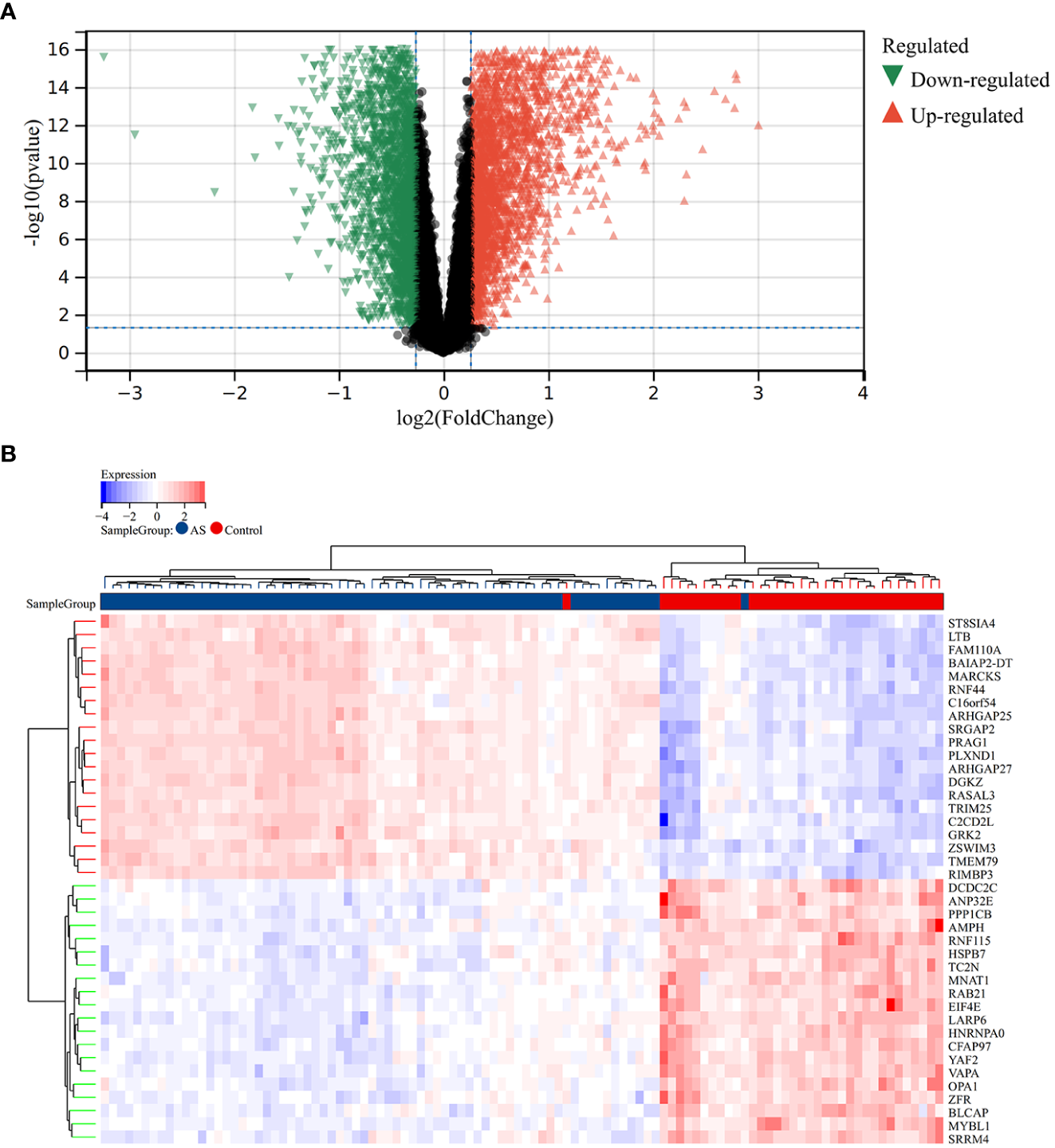 Different expression genes between AS and control groups. (A) Red and green represent DEGs with significantly higher and lower expression level in AS groups, respectively. (B) The heatmap showed the top 20 genes that were significantly expressed in the RA and control groups.