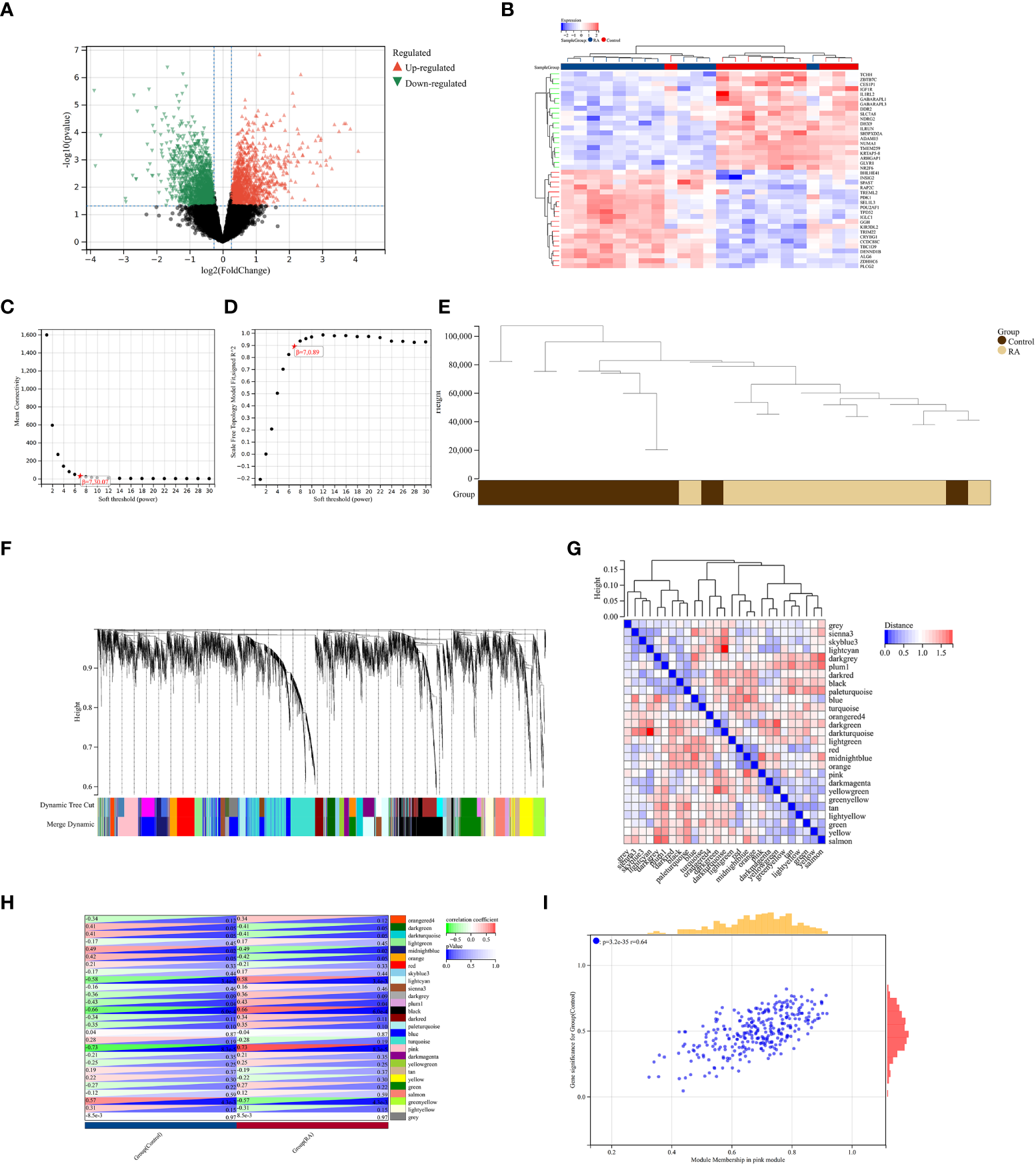 Identification of DEGs via Limma and WGCNA module genes in RA. (A) The volcano plot represents DEGs, of which the red and green triangles refer to significant genes. (B) The heatmap shows the top 20 upregulated and downregulated DEGs from the RA dataset, which are shown in red and blue colors. (C, D)β = 7 is chosen as the soft threshold based on the scale independence and average connectivity. (E) Clustering dendrogram of the RA and control samples. (F) Gene co-expression modules with different colors under the gene tree. (G) Heatmap of eigengene adjacency. (H) Heatmap of correlation between module genes and RA shows that the pink module has the highest association with RA. For each pair, the top left triangle is colored to represent the correlation coefficient; the bottom right one is colored to indicate the p-value. (I) Correlation plot between module membership and gene significance of magenta module genes.