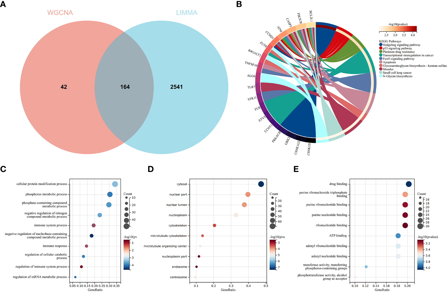 KEGG analysis elucidated that common genes were involved in “p53 signaling pathway” and “Apoptosis”, as shown in Figure 4B. The results of GO analysis revealed that common genes were enriched in biological process (BP) terms, including “immune system process”, “immune response”, and “regulation of immune response”, as shown in Figure 4C. For cellular component (CC) ontology, the common genes are involved in “cytosol”, “nuclear part”, and “nuclear lumen”, as shown in Figure 4D. For molecular function (MF), the results showed that “drug binding” was the most significant term in common genes, as shown in Figure 4E.
