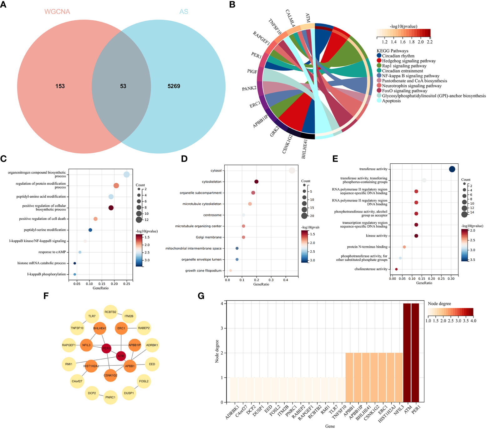 Functional enrichment analysis of common genes from RA with AS and the recognition of node genes with the PPI network. (A) Venn diagram shows 53 genes are recognized from the intersection of genes in RA with Limma and SLE with WGCNA. (B) KEGG analysis of 53 common genes. (C–E) GO analysis (biological process, cellular component, and molecular function) of 53 common genes. (F) The PPI network demonstrates that 23 genes interact with each other. (G) The column shows the gene nodes of 23 genes in the PPI network.
