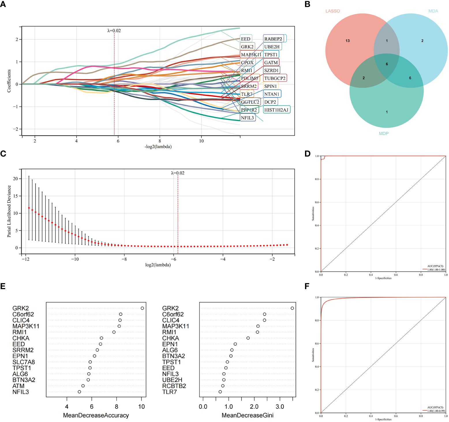 Machine learning in identifying key diagnosis genes for RA with AS. (A, B) Key genes identified in the LASSO model. Twenty-two genes are the most suitable for diagnosis. (C) The random forest algorithm ranks the top 15 most important genes based on MDA and MDP. (D) The intersection of genes of the above two algorithms is shown in the Venn diagram. (E) The ROC curve of the LASSO model. (F) The ROC curve of random forest algorithm.