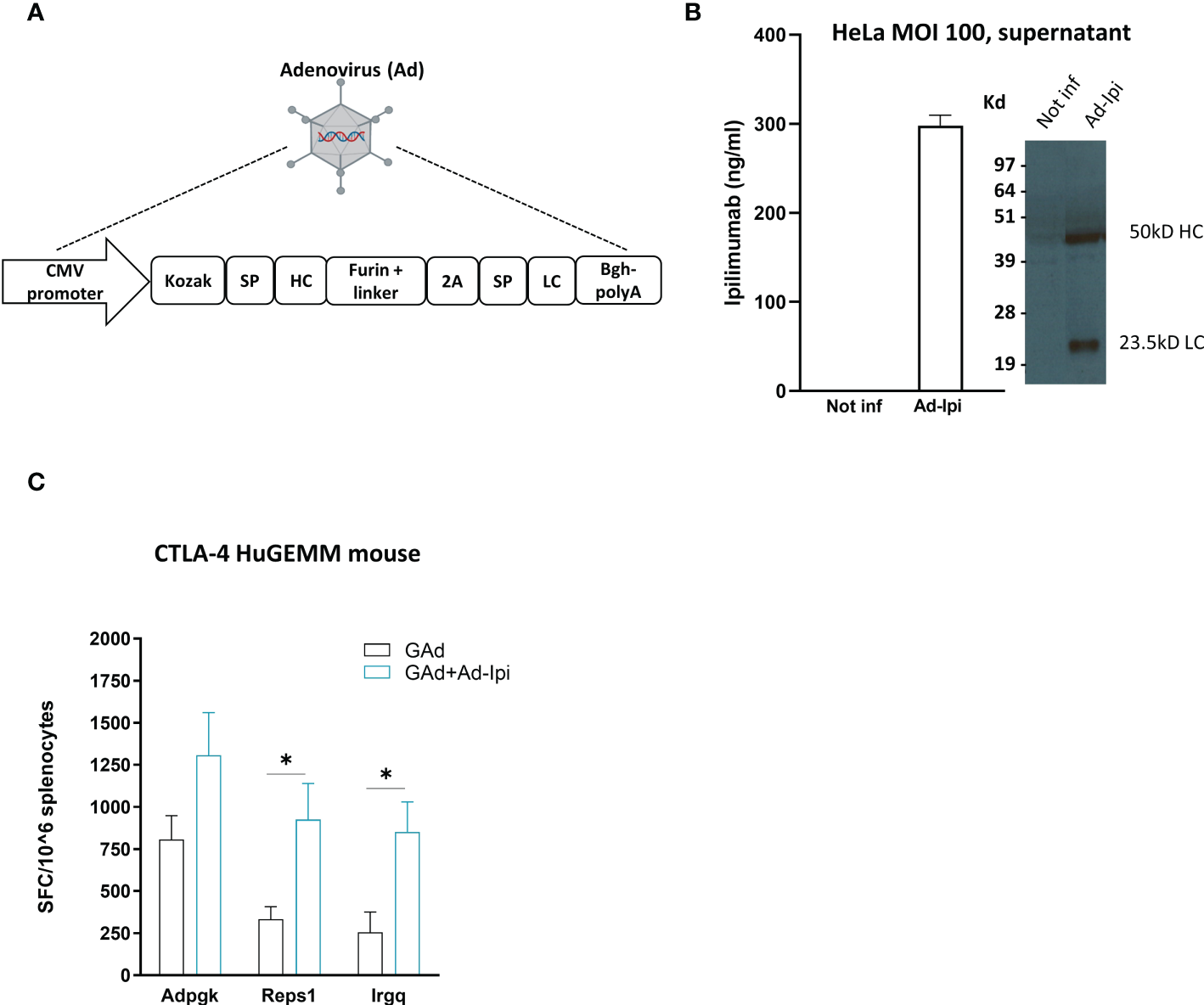 In vivo adjuvant effect of Adeno-encoded human anti-CTLA-4 on vaccine induced T cell responses (A) Layout of Ipilimumab construct encoded in a replication defective Adenovirus 6 (Ad-Ipi). SP = Signal peptide; HC = Heavy chain; LC = Light chain. (B)In vitro expression of encoded Ipilimumab in HeLa cells infected with Ad-Ipi at the indicated MOI (Multiplicity of infection) and assessed by Elisa and Western Blot on supernatant collected 48 hours post infection. In vitro experiments were performed in triplicate. (C) Effect of Ad-Ipi on immunogenicity of GAd-7nag vaccine in transgenic mice expressing human CTLA-4 (CTLA-4 huGEMM). T cell responses against 3 individual neoantigens (Adpgk, Reps1, Irgq) were measured by IFN-γ EliSpot on mouse splenocytes (n = 6), 14 days after vaccination with GAd-7nag vaccine administered alone or in combination with Ad-Ipi. Two-tailed Mann-Whitney U-test; *p<0.05.
