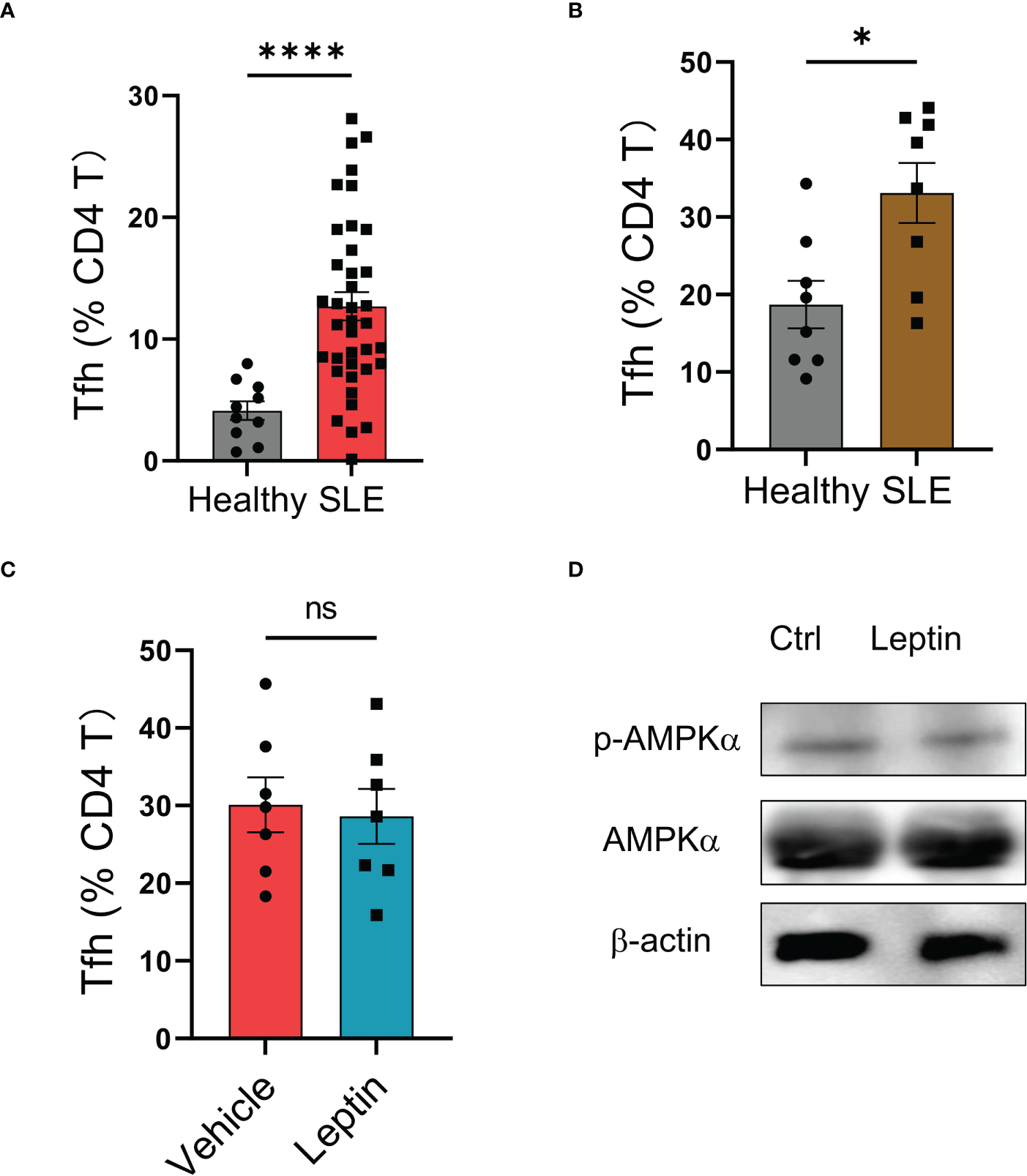 Figure 4 Leptin exerts no significant effect on SLE Tfh cells. (A) SLE patients (n=38) and healthy donors (n=10) were analyzed for circulating frequencies of Bcl-6-expressing Tfh cells. Each dot represents data from one individual. ****p < 0.0001 with unpaired MWW test. (B) CD4 T cells from SLE patients (n=8) or healthy controls (n=8) were stimulated with anti-CD3/CD28 beads for 4 days. Each dot represents data from one individual. *p < 0.05 with unpaired MWW test. (C) CD4 T cells from SLE patients (n=7) were stimulated with anti-CD3/CD28 beads in the presence or absence of recombinant leptin protein (100 ng/ml) for 4 days. Each dot represents data from one individual. Unpaired MWW test. (D) SLE CD4 T cells were stimulated with anti-CD3/CD28 beads in the presence or absence of recombinant leptin protein (100 ng/ml) for 3 days and analyzed for intracellular phosphor-AMPKα using immunoblots. A representative from 4 patients. ns, no significance.