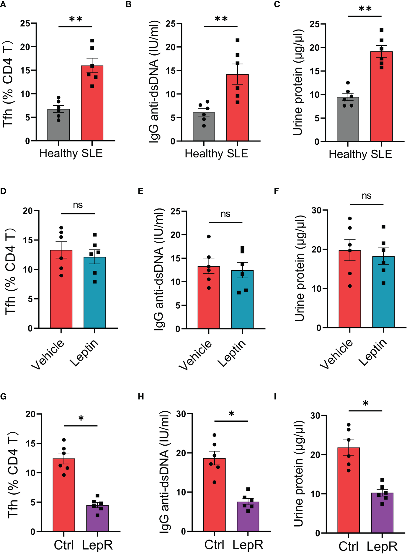 Figure 6 Targeting LepR recuses inhibitory activities of leptin on lupus development in humanized chimeras. (A–C) NSG mice reconstituted with SLE PBMCs (n=6) and healthy PBMCs (n=6) respectively were detected for splenic Bcl-6-expressing Tfh cells, serum IgG anti-dsDNA and urine protein at 4th week. Each dot represents data from one chimera. **p < 0.01 with unpaired MWW test. (D–F) Humanized SLE chimeras were treated with (n=6) or without (n=6) low-dose recombinant leptin protein after immune reconstitution, and analyzed for splenic Bcl-6-expressing Tfh cells, serum IgG anti-dsDNA plus urine protein at 4th week. Each dot represents data from one chimera. Paired MWW test. (G–I) SLE CD4 T cells were transected with LepR expression vector (n=6) or the control (n=6) prior to immune reconstitution of chimeras. Splenic Bcl-6-expressing Tfh cells, serum IgG anti-dsDNA and urine protein were analyzed at 4th week post immune reconstitution plus low-dose leptin treatment. Each dot represents data from one chimera. *p < 0.05 with paired MWW test. ns, no significance.