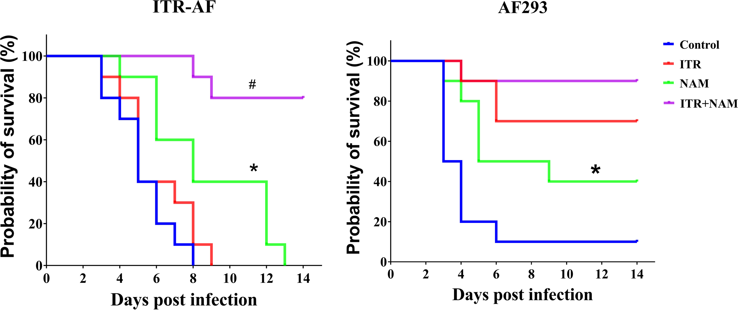 Treatment was initiated 2 h after the infection. Briefly, the mice were treated with NAM (500 mg/kg intraperitoneally daily) and/or ITR (25 mg/kg orally twice a day) for 10 d. The control mice were infected and treated with relevant vehicles. The mice wereobserved at least 4 times daily and were humanely terminated when the mobility was reduced severely or in substantial distress. The endpoint time of the survival experiment was 14 d post infection. Subsequently, all surviving mice were terminated humanely.