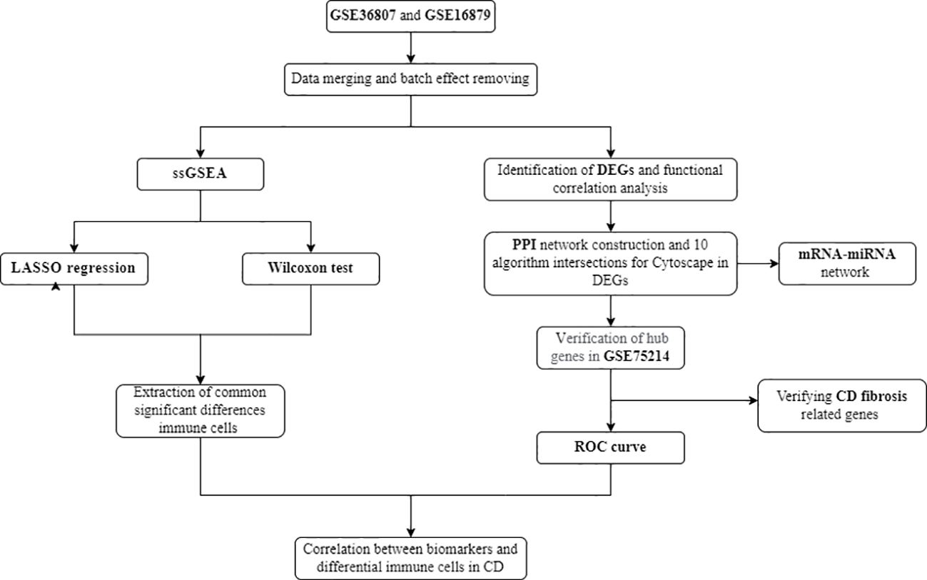 As one of the most common complications of CD, intestinal fibrosis (IFB) can lead to intestinal stenosis and bowel obstruction. It is currently believed that CD intestinal fibrosis involves pathological processes such as fibroblast migration and proliferation, epithelial mesenchymal transition (EMT), extracellular matrix deposition (ECM), which affect the structure and function of intestinal tissue and lead to irreversible organ damage (9, 10). Within 10 years after CD diagnosis, 70% of patients will develop fibrotic stenosis (11, 12). However, at present, CD fibrosis is mostly diagnosed through invasive pathological examination, and due to diagnostic difficulties, early intervention is not possible. The disease often develops to an irreversible stage, and even becomes important during inevitable surgery. Research has found that inflammation is an important driving factor in inducing intestinal fibrosis, but when intestinal inflammation is effectively controlled, the process of intestinal fibrosis cannot be completely blocked. Simply controlling inflammation can only slow down the pathological process of fibrosis, but cannot prevent its continued development (11, 13). Therefore, as one of the important complications of CD, intestinal fibrosis in Crohn’s disease remains a key issue that needs to be addressed in clinical practice. It is particularly important to pay attention to and conduct in-depth research on the mechanisms of intestinal fibrosis in CD, and to find important molecular targets. The analysis process is shown in Figure 1.