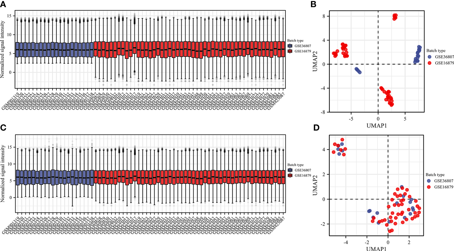 Data preprocessing. Box plot and uniform manifold approximation and projection were performed to remove batch correction of GSE36807 and GSE16879. (A, B) before batch correction and (C, D) after batch correction.