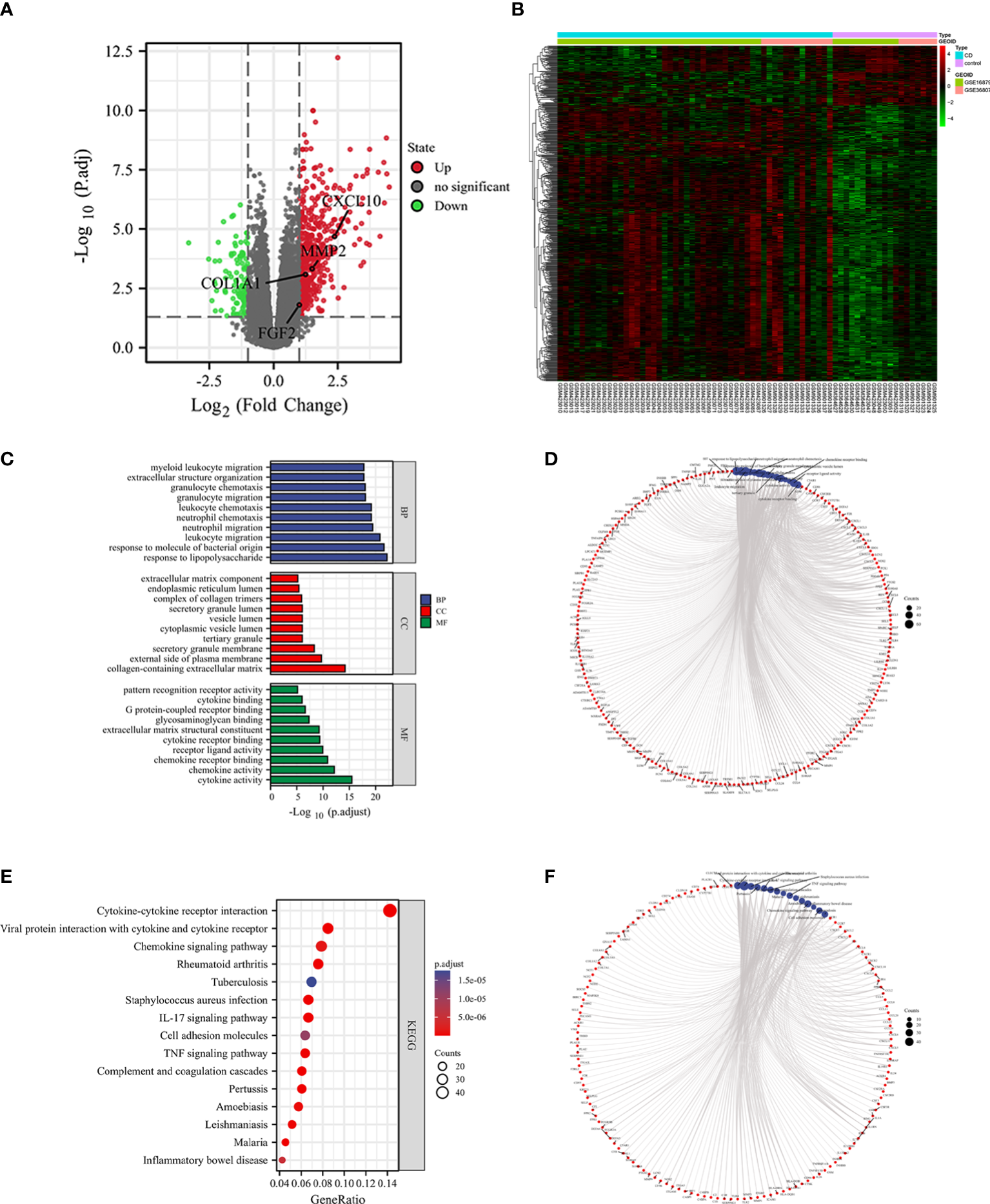 A total of 634 differential genes were identified in CD compared to HC samples, containing 521 up-regulated genes and 113 down-regulated genes. The differential genes were visualized using heat map and volcano map (Figures 4A, B). GO term was used to analyze the functional enrichment of DEGs involved in biological process (BP) closely related to the immune response. It involves the chemotactic and migratory responses of leukocytes, again dominated by neutrophils. As well as the cellular response to lipopolysaccharide (LPS), a component of the outer wall of the cell wall of bacteria, Gram-negative bacteria. The molecular functions (MF) involved are mainly related to cytokine activity, chemokine activity, receptor ligand activity, etc. The top 10 entries were selected according to the threshold p.adj<0.05 to draw a bar graph, and the top 5 entries for each of BP, CC (cellular component), and MF were selected to draw a circle graph (Figures 4C, D). Combined with the results of KEGG pathway enrichment showed that DEGs were closely related to immune response-related signaling pathways. They were mainly enriched in signaling pathways such as cytokine-cytokine receptor interaction, interleukin-17, tumor necrosis factor and inflammatory bowel disease. The top 10 pathways of KEGG were selected according to the threshold p.adj<0.05 to draw bubble diagrams, and the top 15 pathways were drawn as circles (Figures 4E, F ).