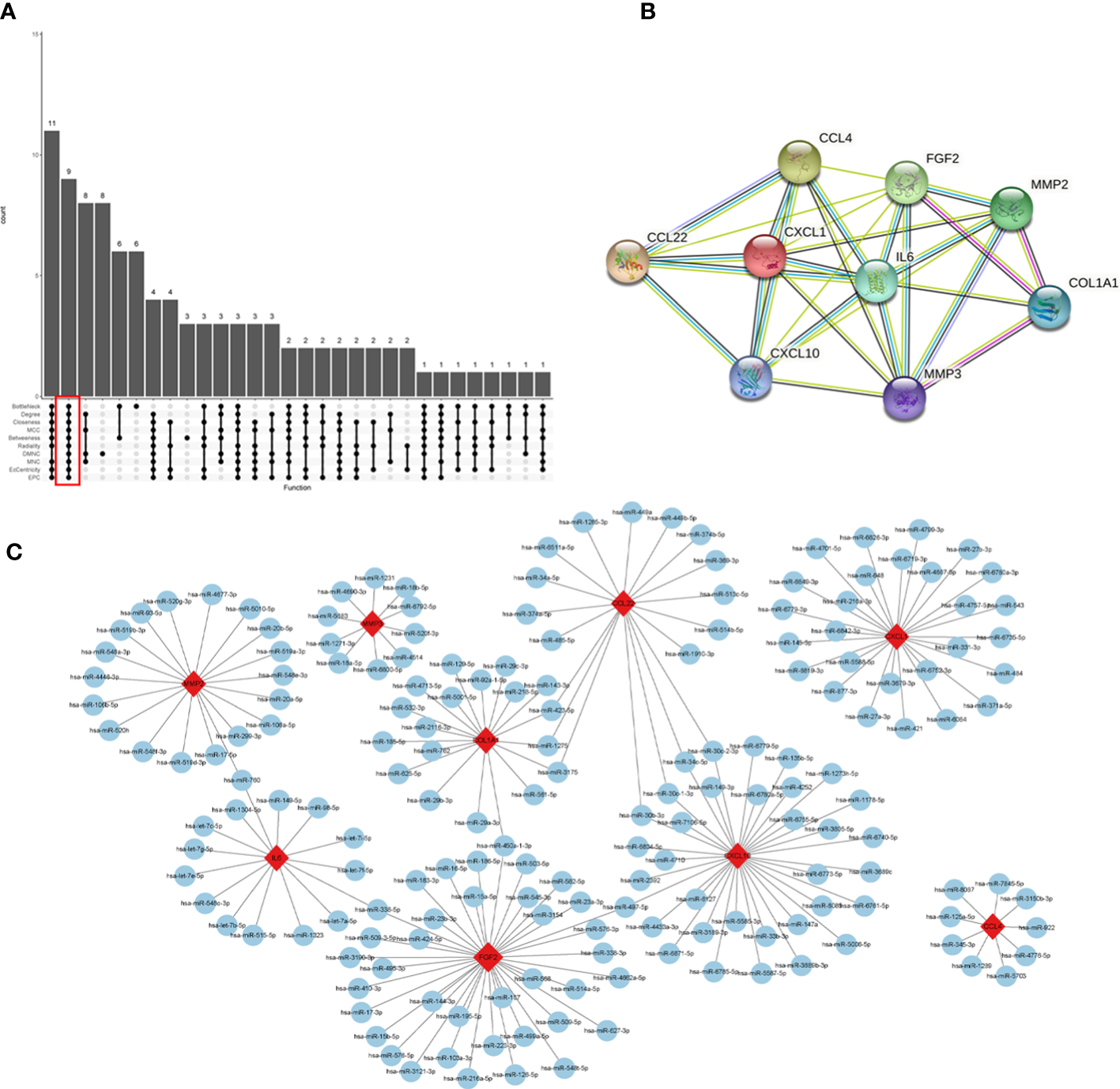 Identification of hub genes and a co-expressed network of mRNAs and target miRNAs. Hub genes were screened by the R package “Upset” (A). Visualization the degree of interaction of 9 hub genes by STRING software (B). The mRNA-miRNA co-expressed network was constructed by Cytoscape including 181 nodes and 192 edges (C).