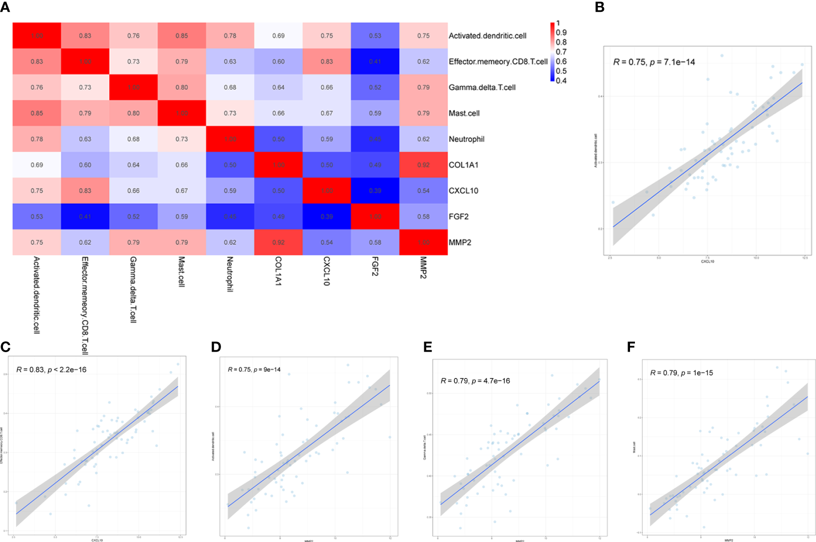 Four biomarkers (COL1A1, CXCL10, MMP2, FGF2) were correlated with five immune cells with significant differences (effector memory CD8+ T cell, neutrophil, mast cell, activated dendritic cell, gamma delta T cell) derived by Wilcoxon test and LASSO regression analysis Correlation analysis was performed between (Figure 9A). Immune cells and biomarkers with significant correlation were screened by R≥0.75, p<0.001. The results showed that CXCL10 was positively correlated with activated dendritic cells (R=0.75, p=7.1e-14) and effector memory CD8+ T cells (R=0.83, p<2, 2e-16) (Figures 9B, C). MMP2 was positively correlated with activated dendritic cells (R=0.75, p=9e-14), γδ T cells (R= 0.79, p=4.7e-16), and mast cell (R=0.79, p=1e-15) were positively correlated (Figures 9D–F).