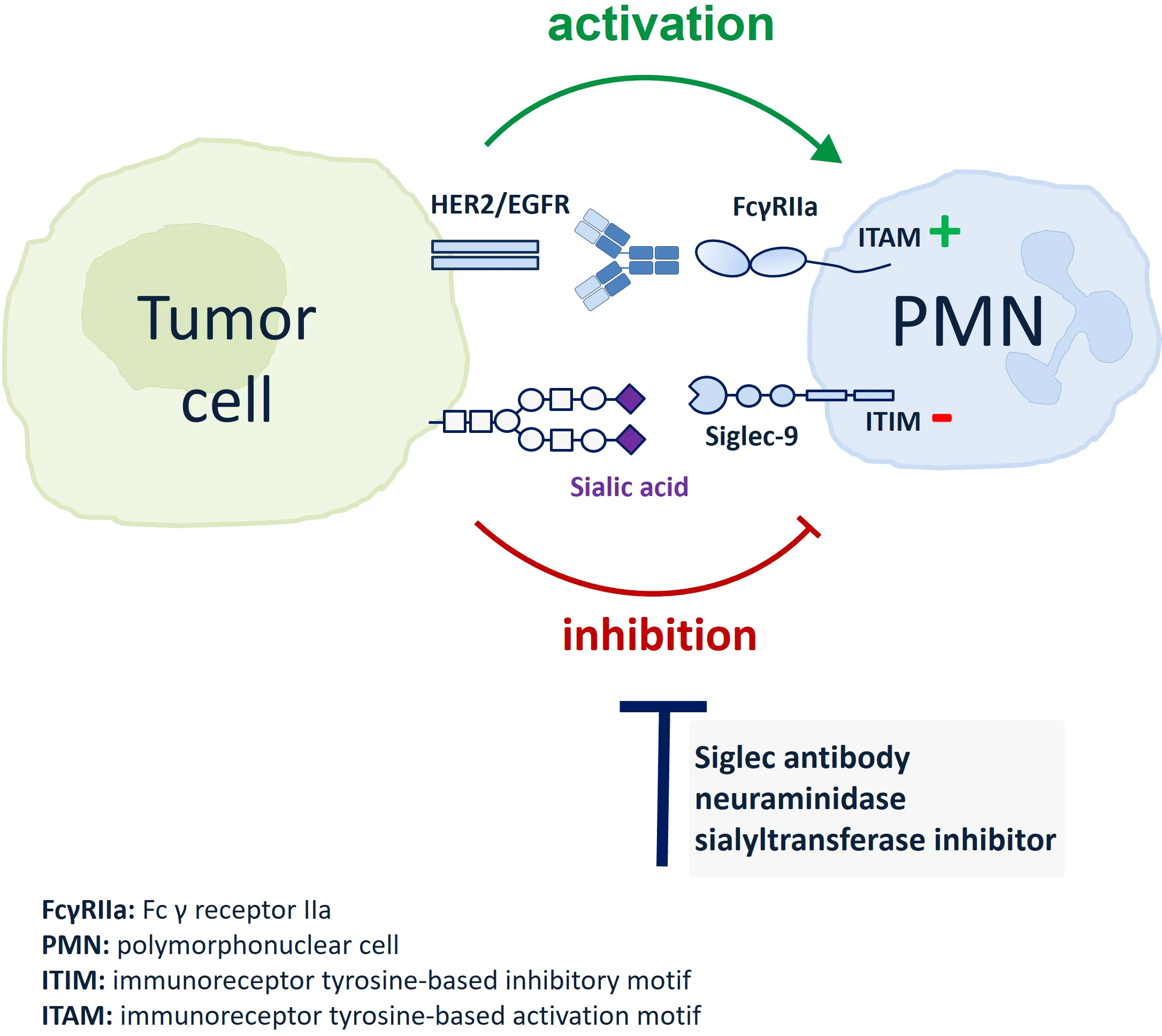 Additional approaches are pursued to exploit the knowledge about the impact of sialic acid/Siglec interactions in tumor immunotherapy. Unfortunately, systemic applications of neuraminidases or sialyltransferase inhibitors - used here to enhance PMN ADCC in vitro and for pre-treatment of tumor cells before in vivo injection – are probably so far not feasible for in vivo application due to their potential toxicity. To overcome the problem of systemic toxicity, a HER2 antibody has been conjugated to sialidase to target sialidase activity specifically to the tumor site (53). In vivo, this HER2 antibody-sialidase conjugate improved the antitumor immune response in mice through the engagement of Siglec-E+, CD11b+ tumor-infiltrating myeloid cells (26). A novel approach to target sialic acid on tumor cells is to combine tumor targeting antibodies with engineered Siglecs in bispecific molecules called AbLecs, which were demonstrated to be more effective than combinations of the respective antibodies and soluble Siglecs (70).