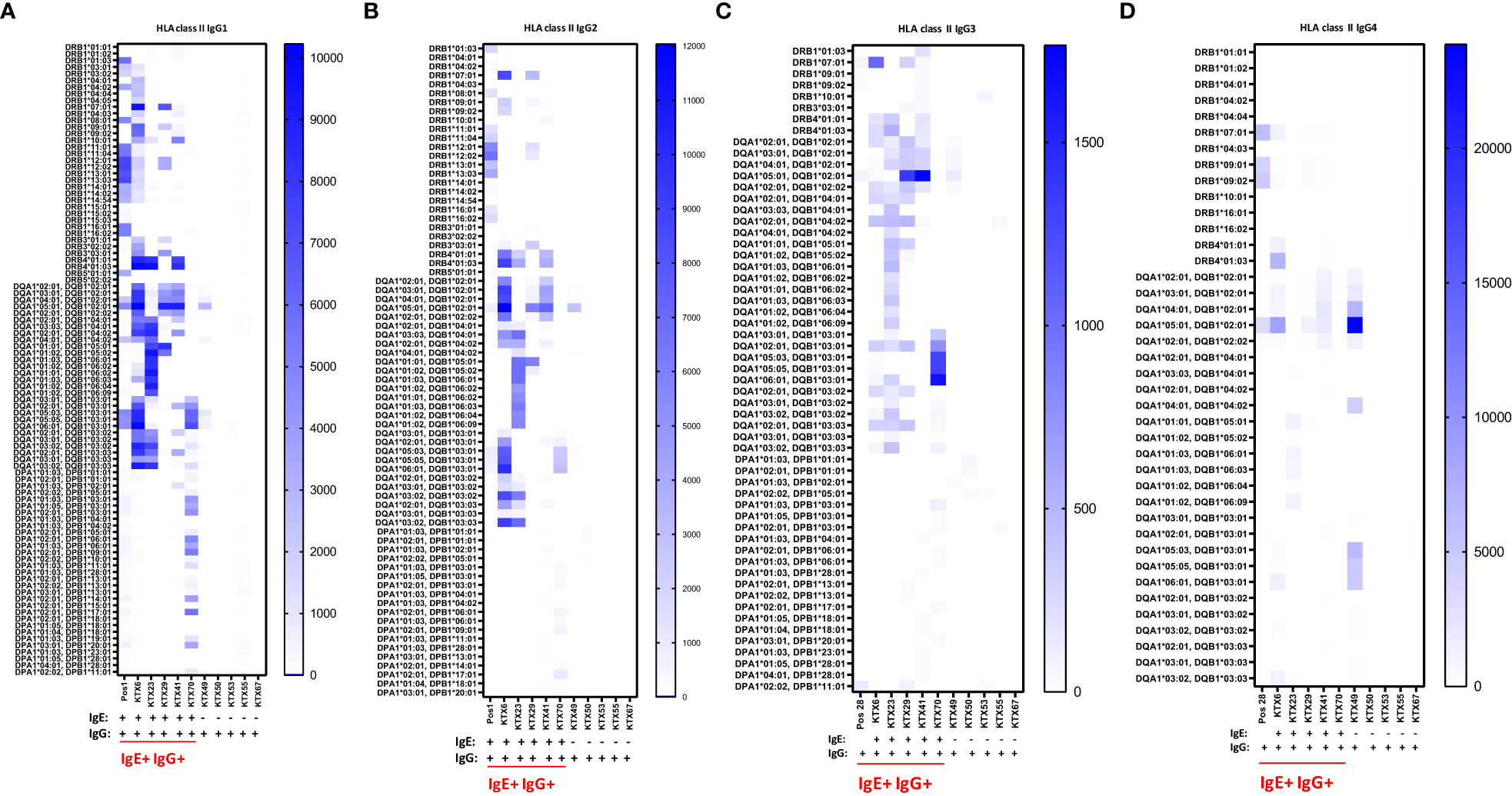 Serum levels of IgG subclasses 1-4 specific for HLA class II in kidney transplant recipients. Patients positive for anti-HLA IgE antibodies (IgE+ IgG+: KTX6, KTX23, KTX29, KTX41 and KTX70) and patients positive only for anti-HLA IgG antibodies (IgG+: KTX49, KTX50, KTX53, KTX55 and KTX67) were investigated for serum levels of (A) IgG1, (B) IgG2, (C) IgG3 and (D) IgG4 by single-antigen bead based assay for HLA class II and signal intensities were expressed as MFIs. Positive control serum (Pos 1) was used for investigation of IgG1 and IgG2 and control serum (Pos 28) for measurements of IgG3 and IgG4. Threshold for positivity was calculated as mean MFI of six HD + 2*SD with a minimum MFI > 25. IgE+ IgG+ patients are underlined in red. MFI intensities of bead signals for subclasses are color-coded in white (negative), light blue and dark blue. Only positive antigen reactivities, to which at least one patient from the measured cohort exhibited a positive signal, are depicted.