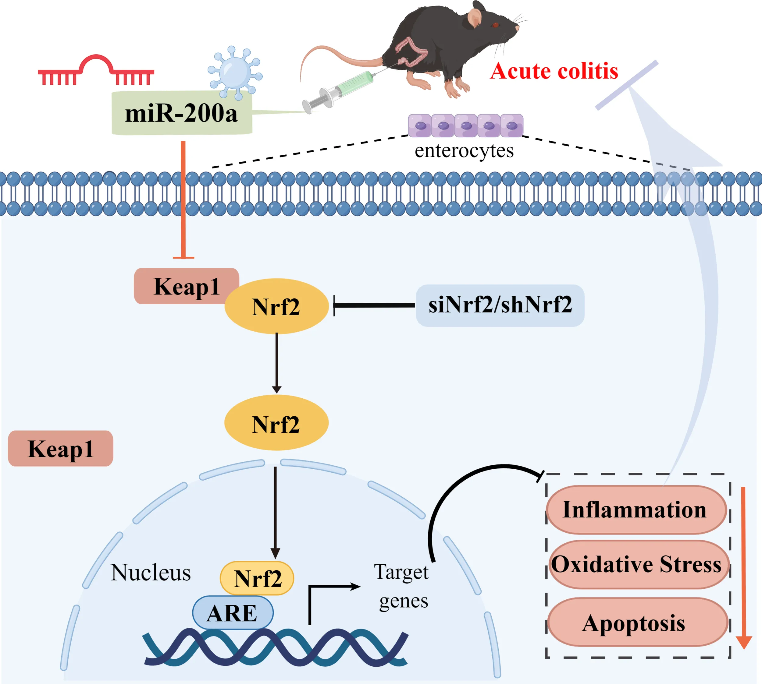 The present study discovered miR-200a down-regulation, excessive inflammatory activation, enterocyte apoptosis, colonic dysfunction, and Keap1/Nrf2 antioxidant pathway inactivation in mouse colitis and NCM460 cells under DSS induction. However, our data demonstrated that miR-200a overexpression represses Keap1 and activates the Nrf2 antioxidant pathway, thereby alleviating these adverse alterations in animal and cellular models. Significantly, following Nrf2 deficiency, we failed to observe the protective benefits of miR-200a against colonic damage.