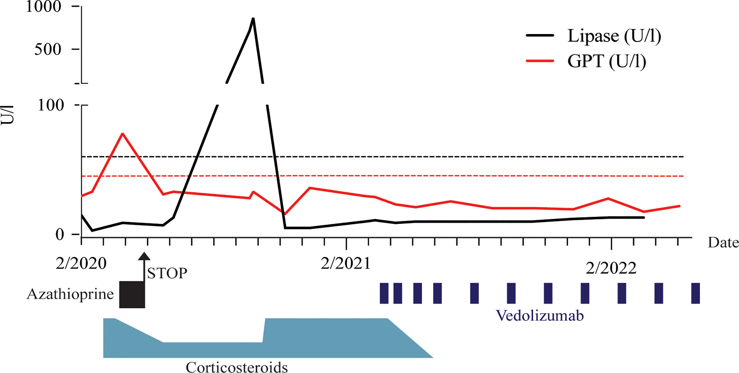 The initial taper quickly resulted in reoccurrence of gastrointestinal symptoms, specifically nausea and diarrhoea. We responded by adding supportive immunosuppression through azathioprine, which eventually had to be discontinued due to a rise in liver enzymes (Figure 2) as well as abdominal pain and nausea. Despite this, steroids could be kept at a low level and even further tapered over the next 6 months. Unfortunately, the patient then had another flare of steatorrhea associated with a dramatic increase in lipase (Figure 2). This prompted a return to high-dose steroid treatment, which could no longer be decreased below 25mg/day without recurrence of symptoms. Under this high dose glucocorticoid regimen, the patient’s type 2 diabetes therapy had to be escalated to include insulin. Because of the ongoing pandemic and concerns regarding the use of Rituximab and concomitant vaccination, we considered available data on a potential alternative for treatment escalation (7).