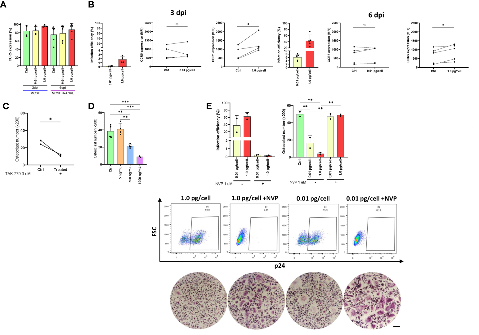 CCR5 expression in osteoclast precursors. Expression of CCR5 on the cell surface (as a percentage of positive cells) in osteoclast precursors after HIV infection (using both inoculums, 0.01 and 1.0 pg/cell) at 3 and 6 dpi measured by flow cytometry (A). The efficiency of HIV infection (measured by flow cytometry as the percentage of cells expressing intracellular p24 antigen) and change in CCR5 expression level (as MFI) between paired samples (control vs. HIV infected) in osteoclast precursors infected with each HIV inoculum at 3 dpi and 6 dpi (B). Quantification of the number of TRAP-positive osteoclasts after CCR5 antagonism using TAK-779 (C) or CCR5 blocking using three different concentrations of recombinant HIV (AD8)-gp120 (D). The efficiency of VSV-G-pseudotyped HIV infection (measured by flow cytometry as the percentage of cells expressing intracellular p24 antigen) and the number of TRAP-positive osteoclasts (x200) at 12 dpi using the two viral inoculums in the absence and presence of nevirapine (E). Scale bar: 200 μm. Data are expressed as mean ± SD obtained from 2-4 independent experiments performed with cells from different donors. *p < 0.001, **p < 0.001, and ***p < 0.0001. ns, not significant.