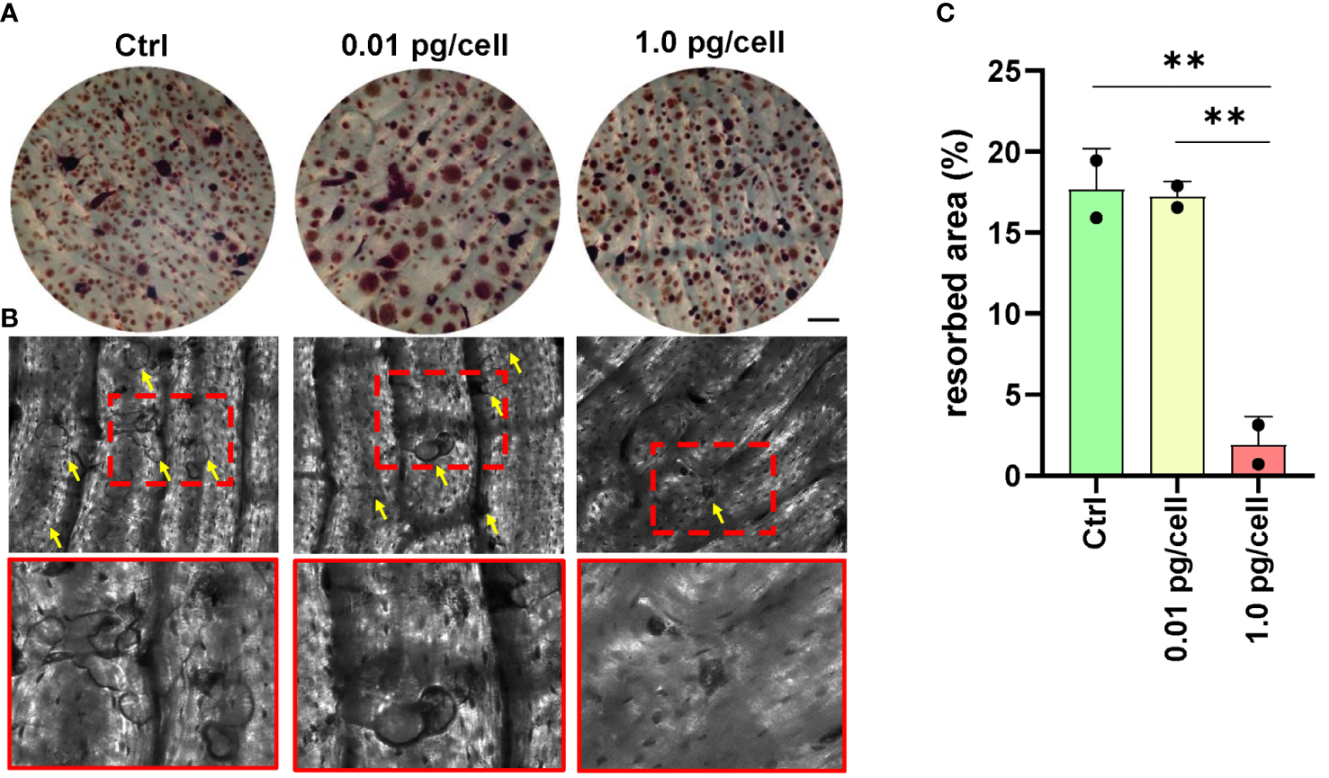 Bone resorption by osteoclasts. Representative data from a donor were obtained using a light microscope to show TRAP-positive (red) osteoclasts differentiated from macrophages during 12 days of culture with RANK-L and M-CSF on bone slices obtained from control (non-infected precursors) and HIV-infected precursors exposed to different viral inoculum (A). The bone resorption pits formed by osteoclasts from precursors (control, and HIV-infected using high and low-inoculum) cultured for 9 days were visualized by staining the slices with toluidine blue. Zoomed-in views of red dashed squares provide more detailed observation (B). The resorption area was observed under a light microscope (x100) and analyzed using Image-J (C). Scale bar: 100 μm. The data represent the mean ± SD of two independent donors, and **p < 0.01 indicates a statistically significant difference.