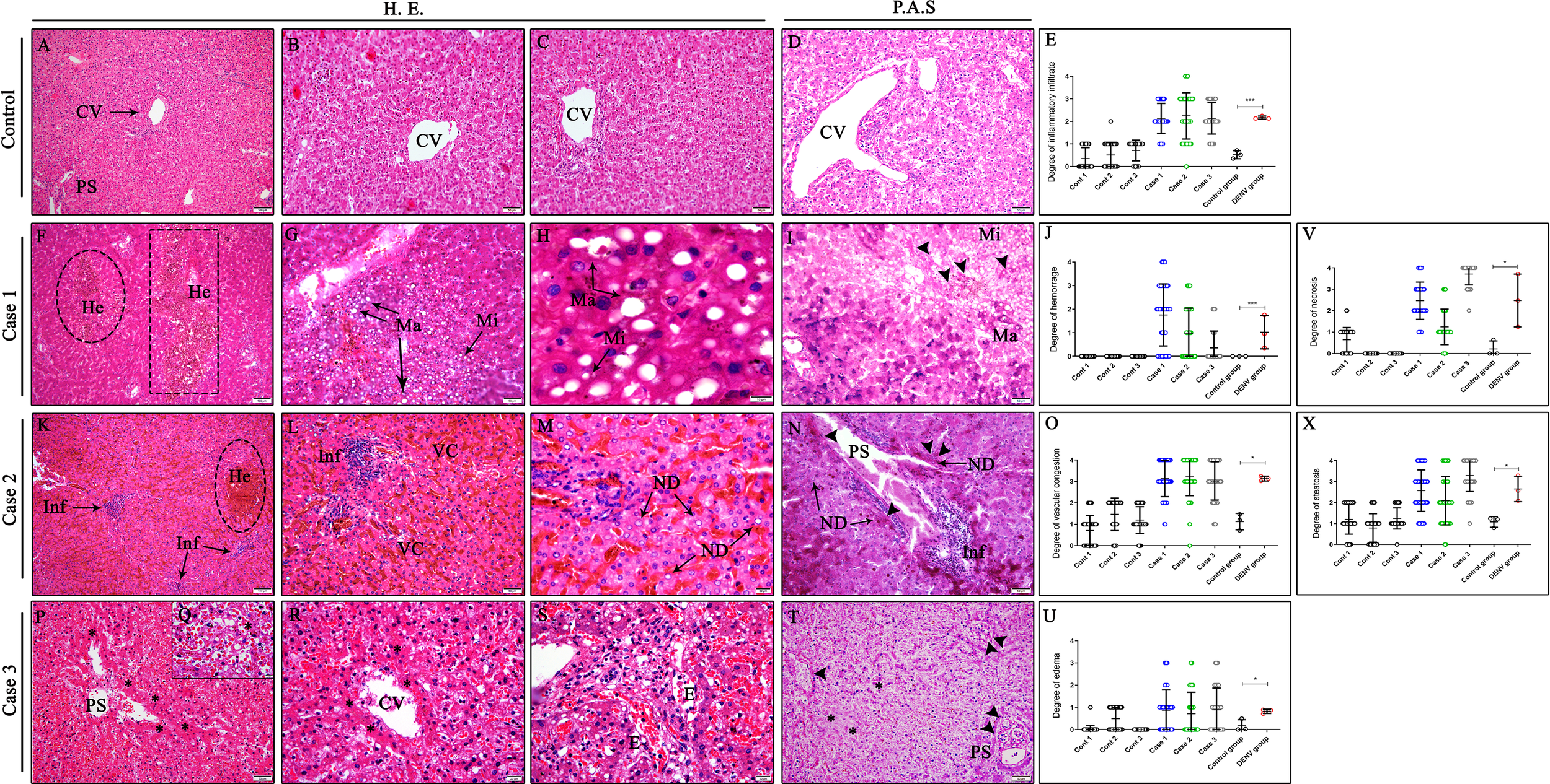 Histopathological aspects of liver tissues from DENV fatal cases of children. (A–D) Liver of non-dengue cases stained with H.E. and PAS presenting well-preserved hepatocytes and normal aspects. Liver sections of dengue fatal cases presenting several hepatic injuries, such as (G, H) macro and microsteatosis, (P–R) necrosis, (M) nuclear degeneration and (F, L, S) circulatory features including hemorrhage, vascular congestion and edema associated with an (K) inflammatory infiltrate. (I, N, T) PAS special stain revealing deposits of glycogen in hepatocytes within steatosis and portal space areas in the three dengue fatal cases. (CV) Centrilobular vein; (PS) Portal space; (He) Hemorrhage; (Ma) Macrosteatosis; (Mi) Microsteatosis; (Inf) Inflammatory infiltrate; (VC) Vascular congestion; (ND) Nuclear degeneration; (E) Edema; (Asterisk) Necrosis areas; (Arrow head) PAS positive stain. (E, J, O, U, V, X) Semiquantitative analysis of alterations in the liver tissue of infected children and control. Asterisks indicate significant differences using F statistical test (*p < 0.05 and ***p < 0.0001). (A, F, K) Magnification 10x, (B–D, G, I, L, N, P, T) magnification 20x, (H, M, Q, R, S) magnification 100x.