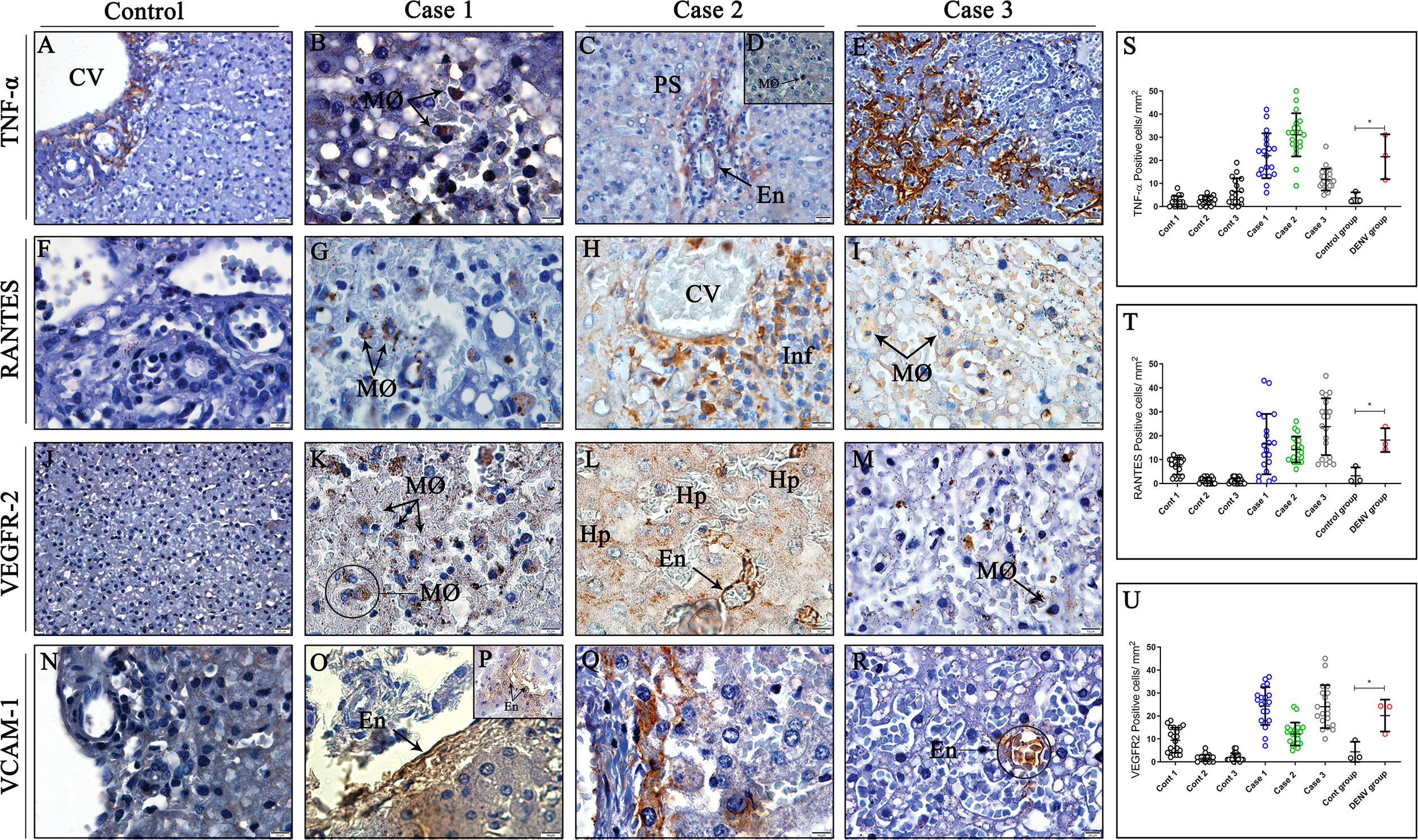 Detection and quantification of cytokines and inflammatory mediators in liver tissues from DENV fatal cases of children. (A) Control tissue presenting expression of TNF-α around the centrilobular vein. (F, J, N) Control tissues presenting little or none expression of RANTES, VEGFR-2 and VCAM-1. (B, D) Expression of TNF-α in macrophages in liver dengue cases. (C, E) TNF-α expression in endothelial cells of portal space and sinusoidal capillaries. (G–I) Expression of RANTES in macrophages and mononuclear infiltrates around centrilobular vein. (K–M) VEGFR-2 expression in hepatocytes, endothelial cells, and infiltrated macrophages. (O, P, R) Endothelial cells expressing VCAM-1 in their surface. (Q) Infiltrating cells perivascular exhibiting VCAM-1 expression. (S–U) Quantitative analysis of TNF-α, RANTES and VEGFR-2 expression in liver tissues. (CV) Centrilobular vein; (PS) Portal space; (Hp) Hepatocytes; (MØ) Macrophages; (Inf) Inflammatory infiltrate; (En) Endothelium. Asterisks indicate significant differences using F statistical test (*p < 0.05). (A, C, E, J, R) Magnification 40x, (B, D, F–I, K-M, N-Q) magnification 100x.