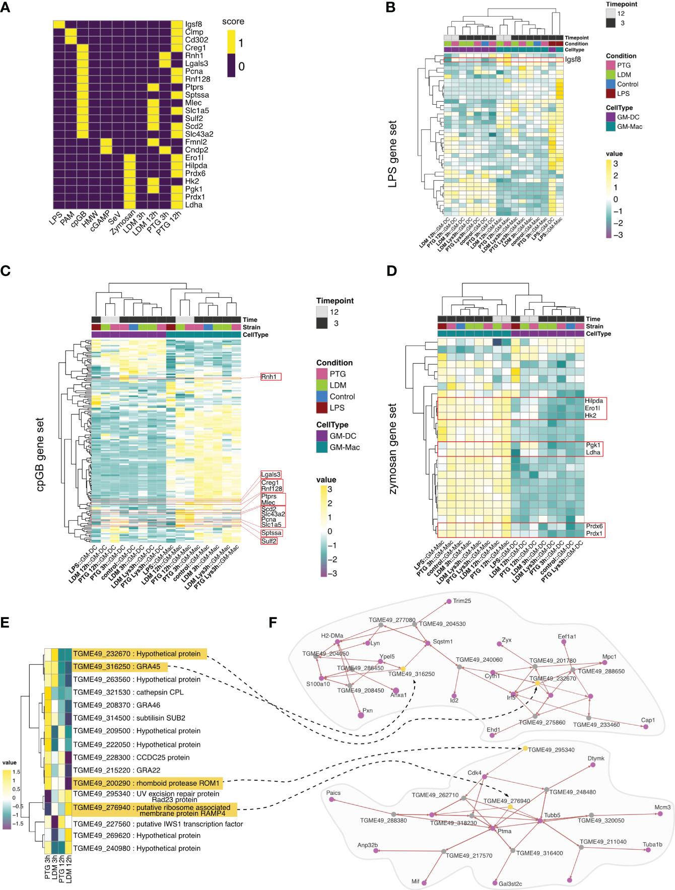 Cell type differentiation and comparative analysis of response to T. gondii infection with established PAMPs and T. gondii INFγ challenge. (A) Heatmap depicting commonly expressed genes between BMDCs exposed to established PAMPs (LPS, PAM, cpGB, HMW, cGAMP,SeV and Zymosan) and cells infected with T. gondii LDM and PTG for 3 or 12 hours. A score of 1 (yellow) indicates differential expression of the gene in the respective condition while a score of 0 indicates no differential expression. (B) Heatmap depicting expression of genes upregulated in LPS treated BMDCs (71), hierarchically clustered by condition in both cell types and gene expression. Expression values are shown in a gradient stretching from negative expression (dark purple) to positive expression (yellow). The red box highlights expressions of Igsf8. (C) Heatmap exhibiting gene expression values for previously identified cpGB signature and (D) zymosan signature. Shared marker genes between the reference signature (71) and our data are highlighted in red boxes. (E) Heatmap visualizing conducted comparative analysis between genes identified to be essential during INFγ stimulation in BMDMs (72) and their expression profiles in T. gondii infective states in our study (LDM and PTG infection 3 and 12 hpi). (F) Co-expression networks for essential T. gondii genes. Genes exhibiting correlation are connected with a black dashed arrow and highlighted in yellow. Correlating host genes are depicted as purple nodes. Remaining T. gondii genes are shown as gray nodes. The arrow indicates the direction of the correlation. Increased arrow width indicates higher correlation value.