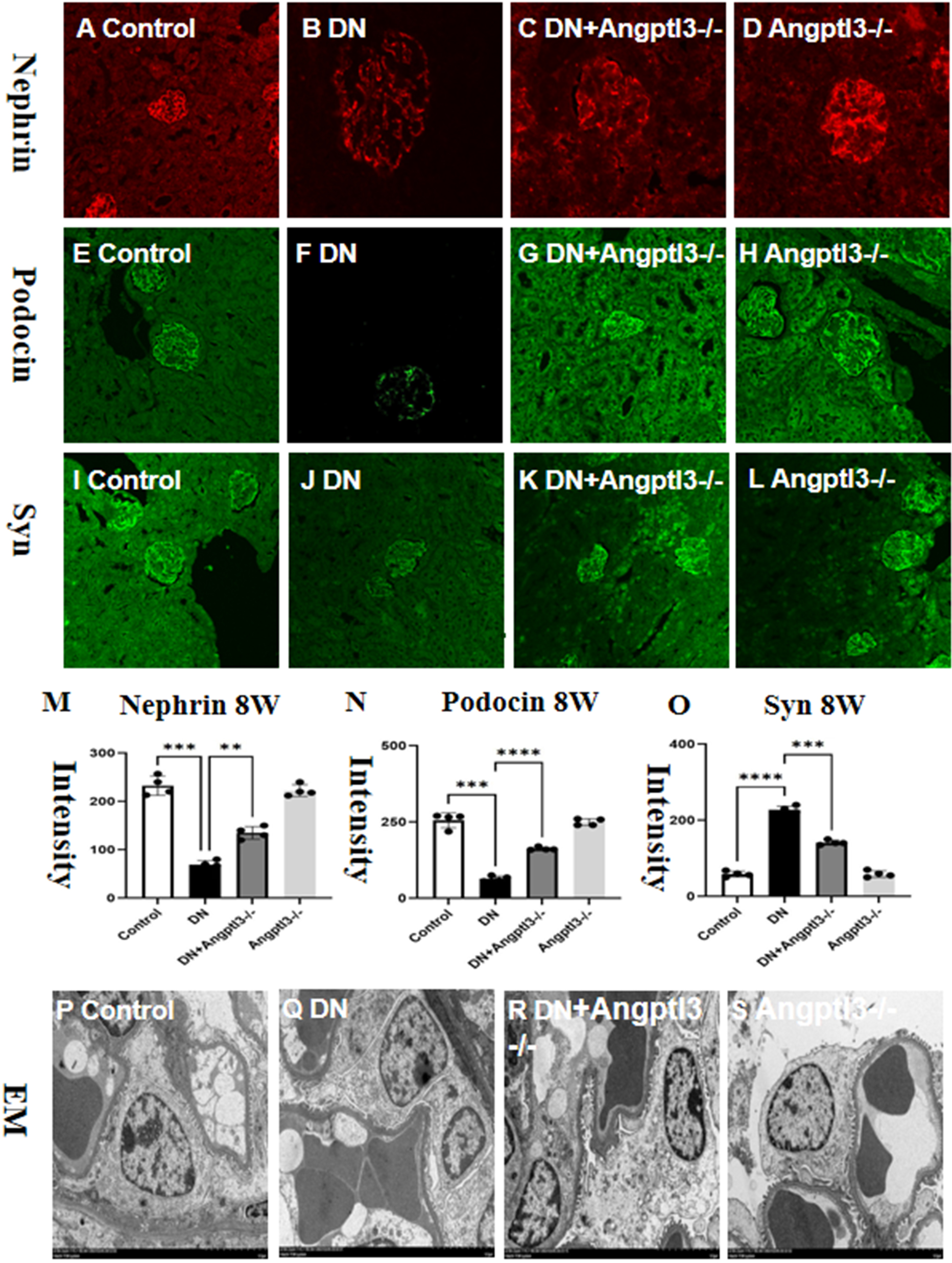 Angptl3 knockout protected podocyte injury in STZ-induced DN mice. The immunofluorescence technique was used to visualize the distribution of nephrin (red channel, A-D), podocin (green channel, E-H), and synaptopodin (green channel, I-L) in the kidney tissue. The fluorescence quantification results are shown in (M-O). The ultrastructural changes in podocytes were assessed using electron microscopy, and the obtained images (10,000×) are presented in (P-S). The sample size was four, and statistical analysis revealed significant differences (**P<0.01, ***P<0.005, ****P<0.001 between the treatment groups. The scale bars for (A–L) and EM were 50 μm and 1 μm, respectively.