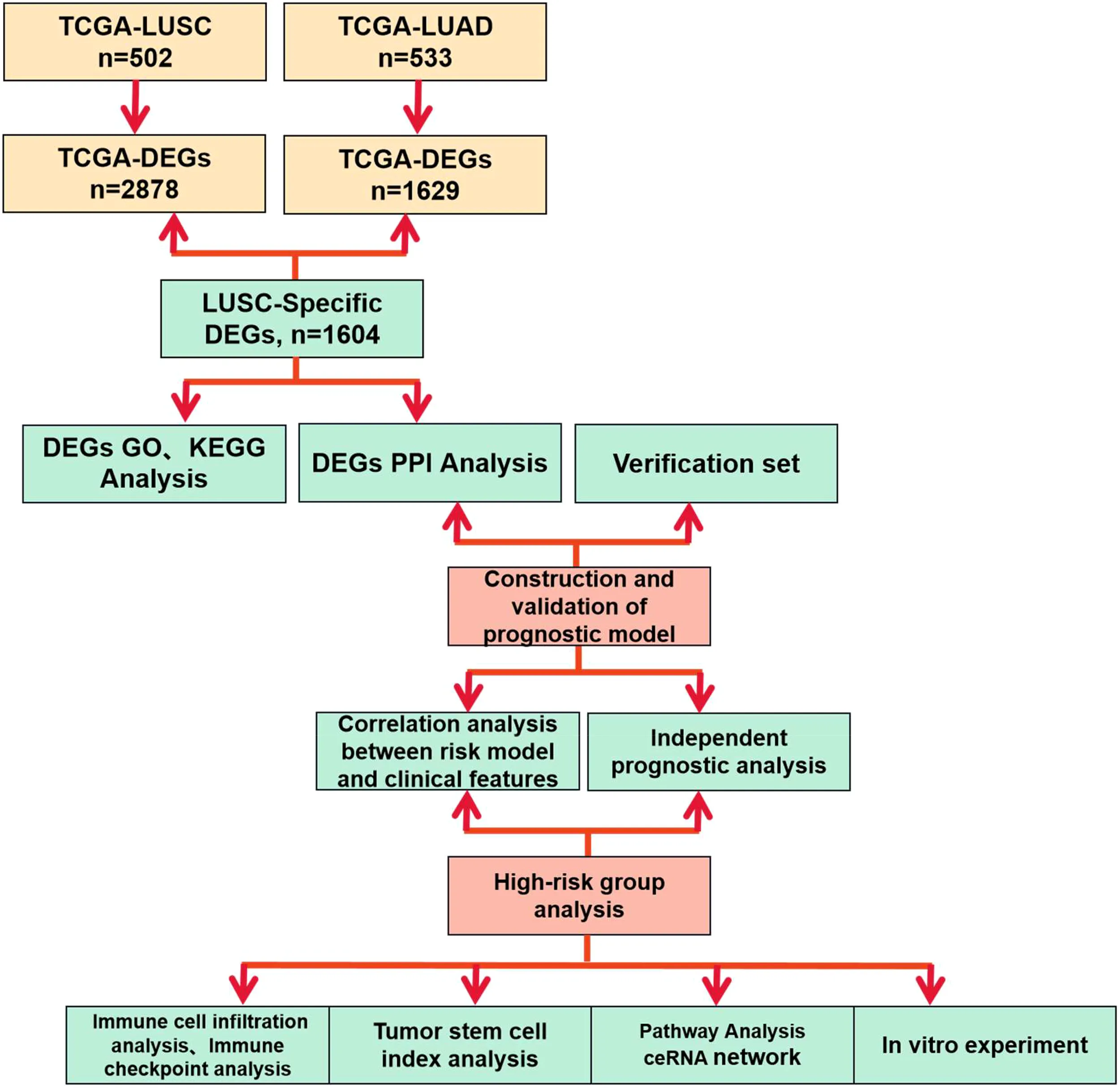 RNA sequencing data for LUSC and lung adenocarcinoma (LUAD) were extracted from The Cancer Genome Atlas (TCGA) data portal, and DEGs analyses were conducted in TCGA-LUSC and TCGA-LUAD cohorts to identify specific DEGs associated with LUSC. Functional analysis and protein–protein interaction network were performed to annotate the roles of LUSC-specific DEGs and select the top 100 LUSC-specific DEGs. Univariate Cox regression and least absolute shrinkage and selection operator regression analyses were performed to select prognosis-related DEGs.