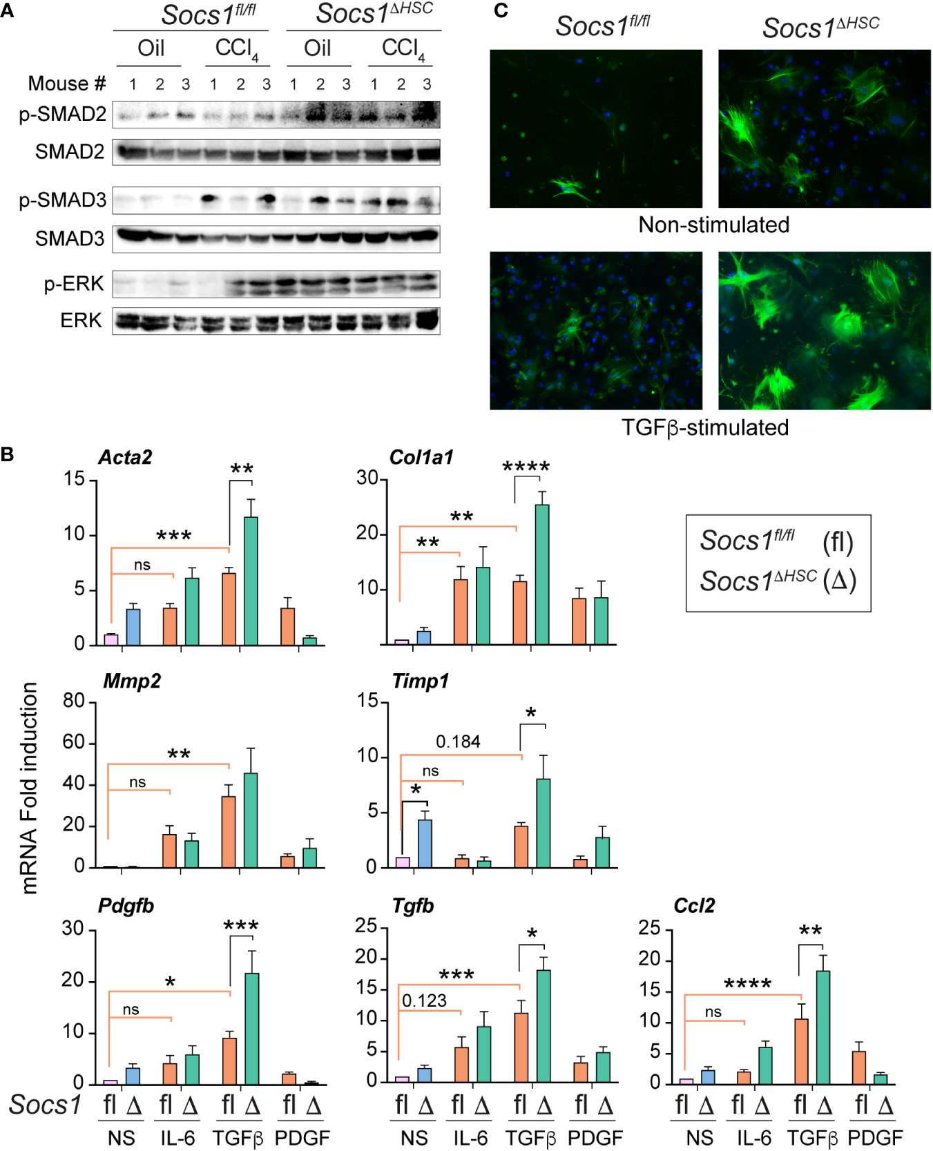 As TGFβ is a key driver of ECM deposition (42, 43), we examined TGFβ signaling pathway components in the fibrotic livers of Socs1ΔHSC and Socs1fl/fl mice. Socs1ΔHSC mice displayed increased phosphorylation of SMAD2 and SMAD3 in both CCl4 and oil treated groups (Figure 2A). On the other hand, increased SMAD3 phosphorylation was observed in the livers of Socs1fl/fl mice only after CCl4 treatment, whereas SMAD2 phosphorylation level was not altered (Figure 2A). Similarly, phosphorylation of the MAP kinase ERK1/2 was prominent in both in both CCl4 and oil treated groups of Socs1ΔHSC mice but occurred only after CCl4 treatment in control mice (Figure 2A). These observations suggested increased responsiveness of SOCS1-deficient HSCs to TGFβ and growth factor signaling that promoted their fibrogenic response. To test this possibility, primary HSCs enriched from Socs1ΔHSC and Socs1fl/fl mice were exposed to inflammatory (IL-6), fibrogenic (TGFβ) and growth stimulating (PDGFB) cytokines and the induction genes that promote myofibroblast differentiation (Acta2) and matrix production (Col1a1) and remodelling (Mmp2, Timp1) was evaluated. TGFβ strongly induced Acta2, Col1a1, Mmp2 and Timp1 genes in control HSCs and the induction of all but Mmp2 were further amplified significantly by SOCS1 deficiency (Figure 2B). Whereas IL-6 caused a discernible increase in the expression of Acta2, Col1a1 and Mmp2 genes in control and SOCS1-deficient HSCs, PDGFB, the most potent growth factor for HSCs (18, 44), did not change the expression of these fibrogenic genes. Notably, SOCS1-deficient HSCs showed discernibly elevated basal expression of Acta2 and Timp1 genes (Figure 2B), suggesting production of autocrine fibrogenic mediators in SOCS1-deficient HSCs. Indeed, TGFβ stimulation upregulated Tgfb and Pdgfb genes in control HSCs that was significantly amplified by SOCS1 deficiency (Figure 2B). Immunofluorescence staining of αSMA following TGFβ stimulation showed profound increase in SOCS1-deficient HSCs compared to control HSCs (Figure 2C). These results indicated that SOCS1 is a critical to regulator of HSC activation by limiting their responsiveness to TGFβ stimulation and TGFβ-induced autocrine mediator production.