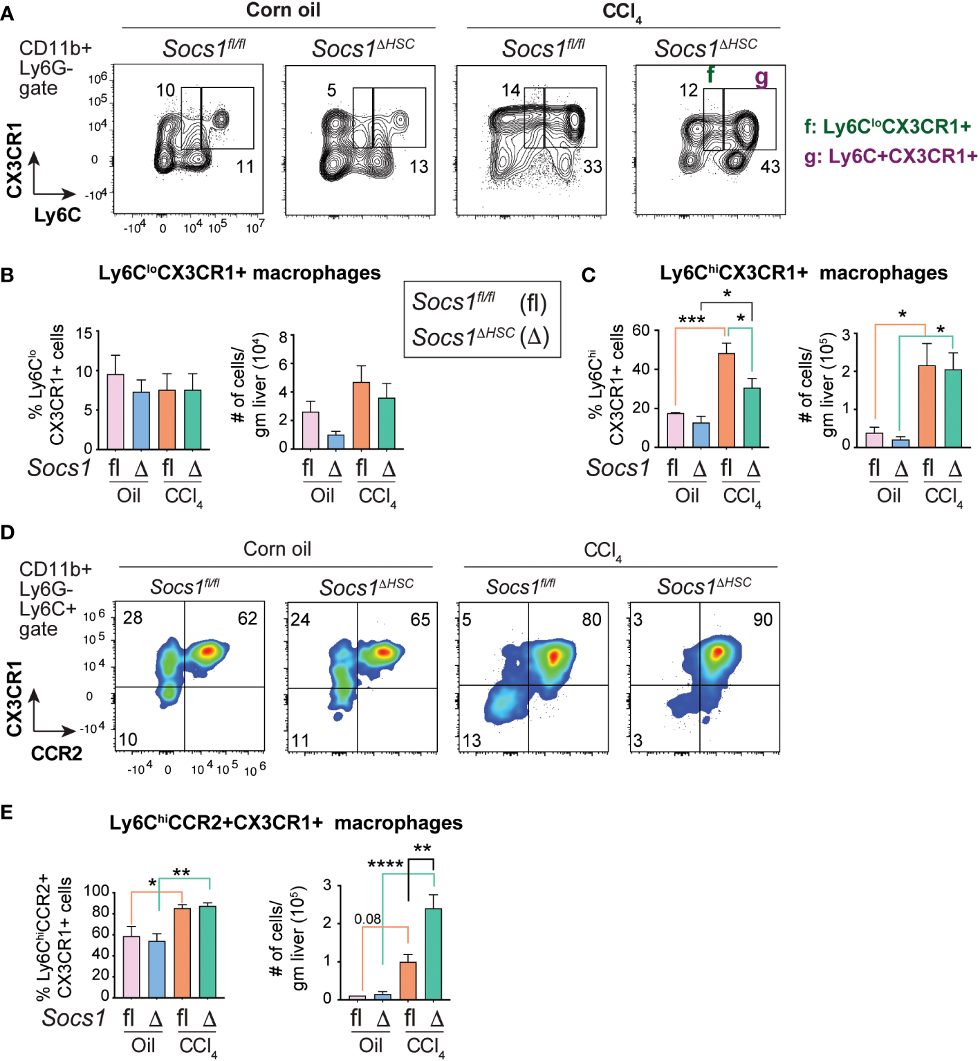 Fibrotic livers of HSC-specific SOCS1 deficient mice accumulate macrophages expressing both CCR2 and CX3CR1. (A) Representative zebra blots showing the expression of Ly6C and CX3CR1 within the CD45+CD11b+Ly6G− cells in the livers of Socs1ΔHSC and Socs1fl/fl control mice. Gates represented by alphabets identify (f) Ly6CloCX3CR1+ and (g) Ly6ChiCX3CR1+ macrophage populations, and the numbers indicate their proportions within the gates. (B, C) Proportions and absolute counts of) Ly6CloCX3CR1+ pro-resolution macrophages compared to the Ly6C+CX3CR1+ proinflammatory subset. (D) Representative density blots showing the expression of CCR2 and CX3CR1 within the CD45+CD11b+Ly6C+ cells in the fibrotic livers of Socs1ΔHSC and Socs1fl/fl control mice. (E) Proportions and absolute counts of Ly6C+CCR2+CX3CR1+ macrophages. Pooled data from 4-6 mice per group from two different experiments are shown (mean ± SEM). One-way ANOVA with Tukey’s multiple comparison test. * p <0.05, ** p <0.01, *** p <0.001, **** p <0.0001.