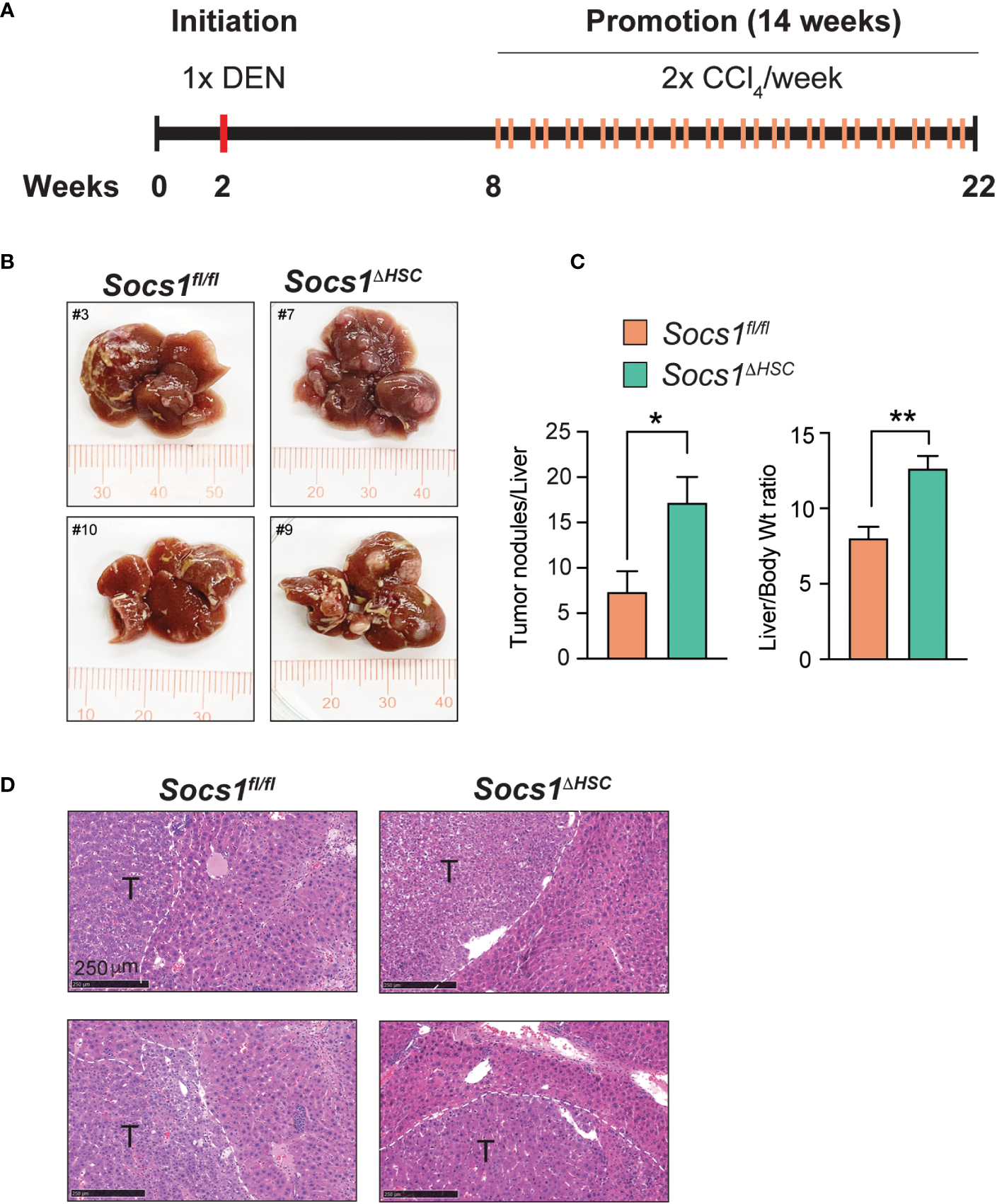 SOCS1 deficiency in HSCs enhances hepatocarcinogenesis in fibrotic livers. (A) Schematic representation of hepatocellular carcinoma induction. Two weeks old Socs1fl/flLratCre mice (n=8) and Socs1fl/fl controls (n=7) were injected with DEN (25 mg/kg BW, i.p.). Six weeks later, the mice were administered CCl4 (0.5 ml/kg BW, i.p.), weekly for 14 weeks, and euthanized at the age of 22 weeks. (B) Representative images of livers showing HCC nodules. (C) Liver to body weight ratio and the number of surface liver nodules per mouse. Data shown as Mean ± SE from 6-7 mice per group were compared by two-tailed unpaired t-test. * p < 0.05, ** p < 0.01. (D) Representative H&E sections of the tumor bearing livers. T, tumor nodule.