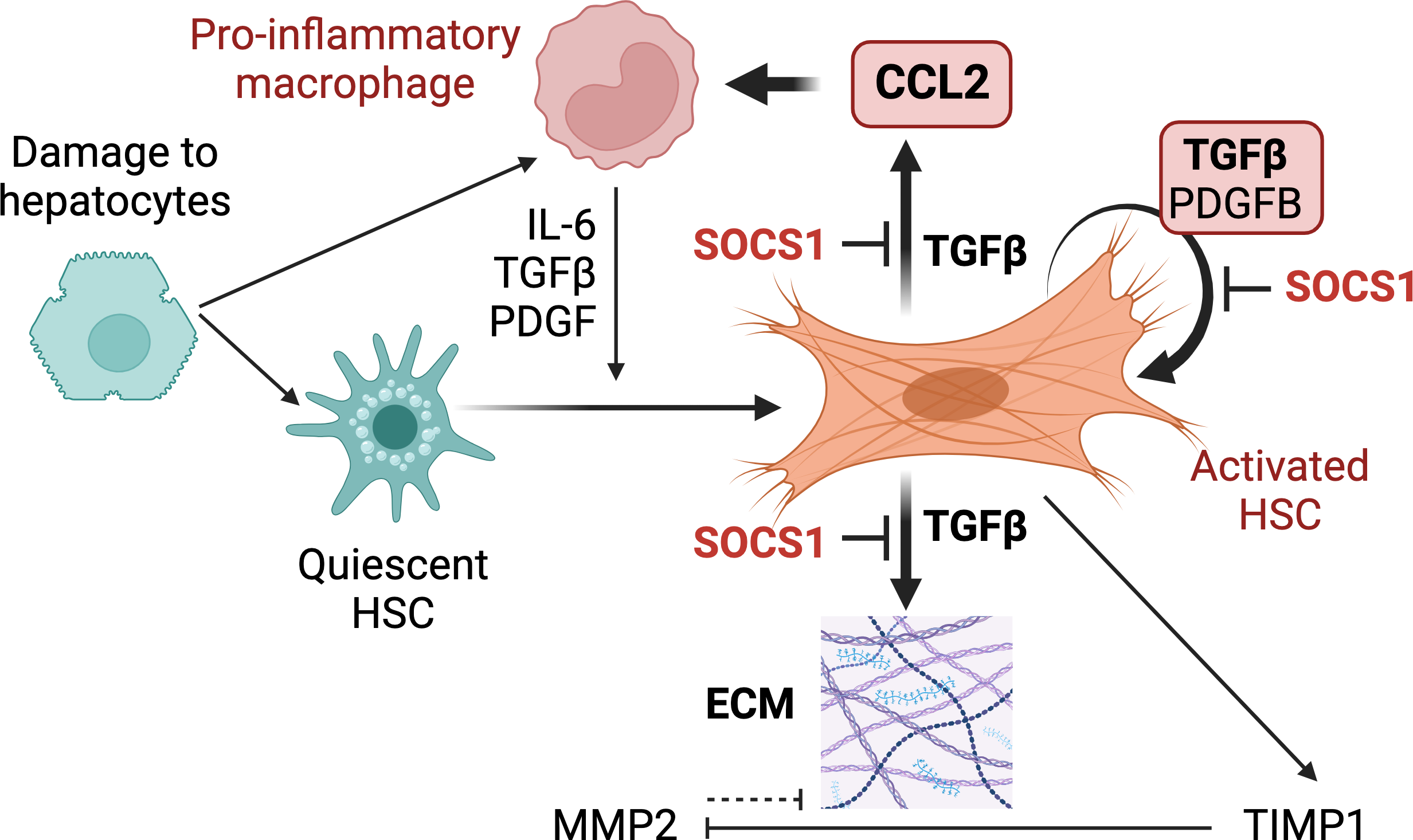 Our findings indicate that (i) SOCS1 expression in HSCs is a critical to control liver fibrosis and development of hepatocaellular carcinoma, and (ii) attenuation of HSC activation by SOCS1 regulates pro-inflammatory macrophage recruitment and differentiation during liver fibrosis.