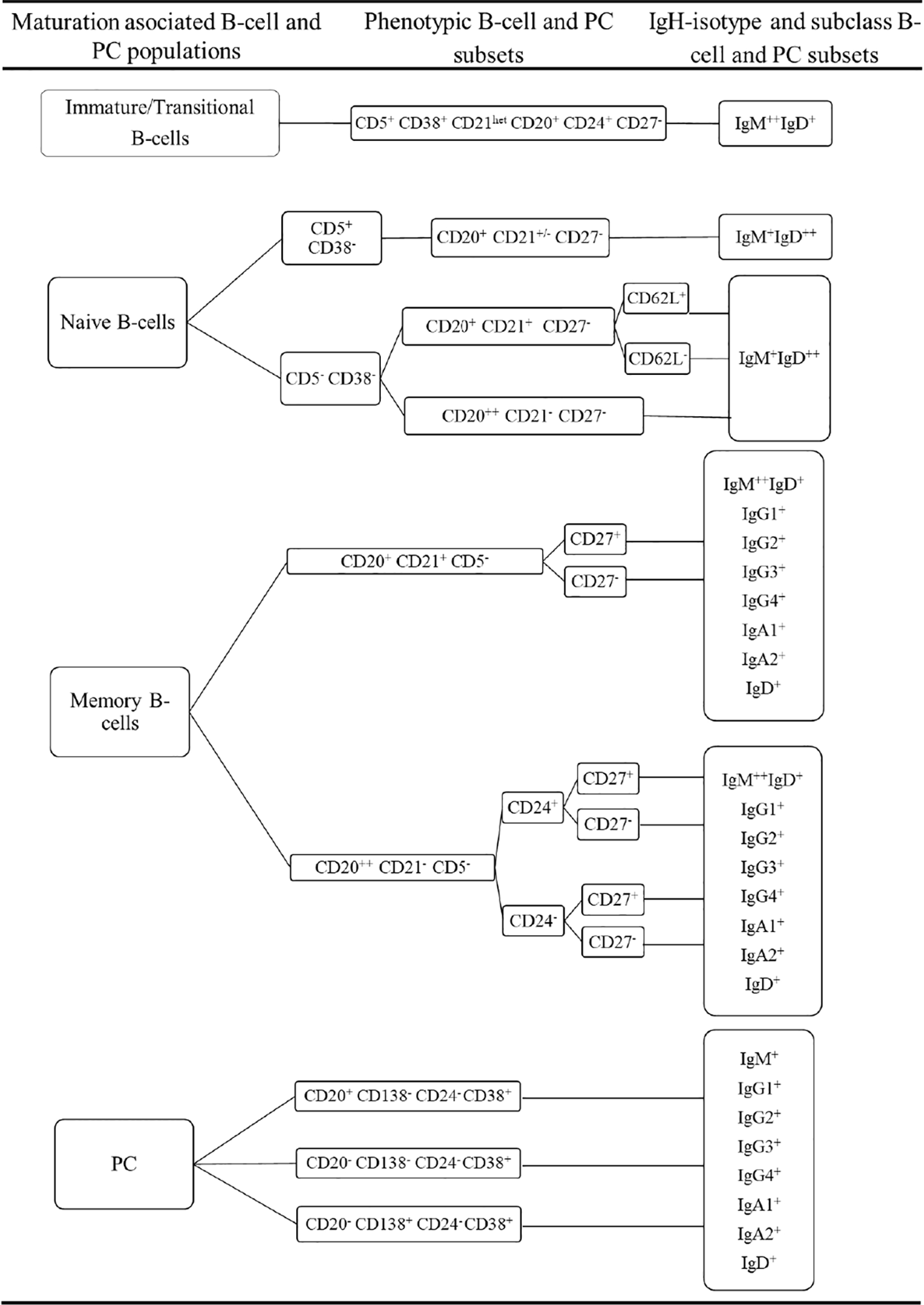 B-cells are key players in the adaptive immune response, where they develop very important roles related to their ability to e.g.: i) mature into plasma cells (PC) capable of producing antigen-specific antibodies of various isotypes and subclasses with multiple immune effector functions (6, 9, 10); ii) generate memory B-cells which can increase (in time and quality) specific immune responses in case of subsequent encounters with an antigen (5, 6); and, iii) act as functional antigen-presenting cells capable of co-stimulating surrounding T-cells (11). Advances in flow cytometry technologies have enabled the identification of >30 subsets of phenotypically and functionally different circulating B-cells in normal blood, which can be further dissected according to the immunoglobulin heavy chain (IgH) isotype and subclass they express (5, 6, 12–14). Of note, the distribution of these distinct maturation-associated functional subsets of B-lymphocytes and PC in blood varies significantly during life, from newborn cord blood to the elderly (5, 6, 10, 15, 16), as well as in different homeostatic states and disease conditions, with important clinical implications (17–24).