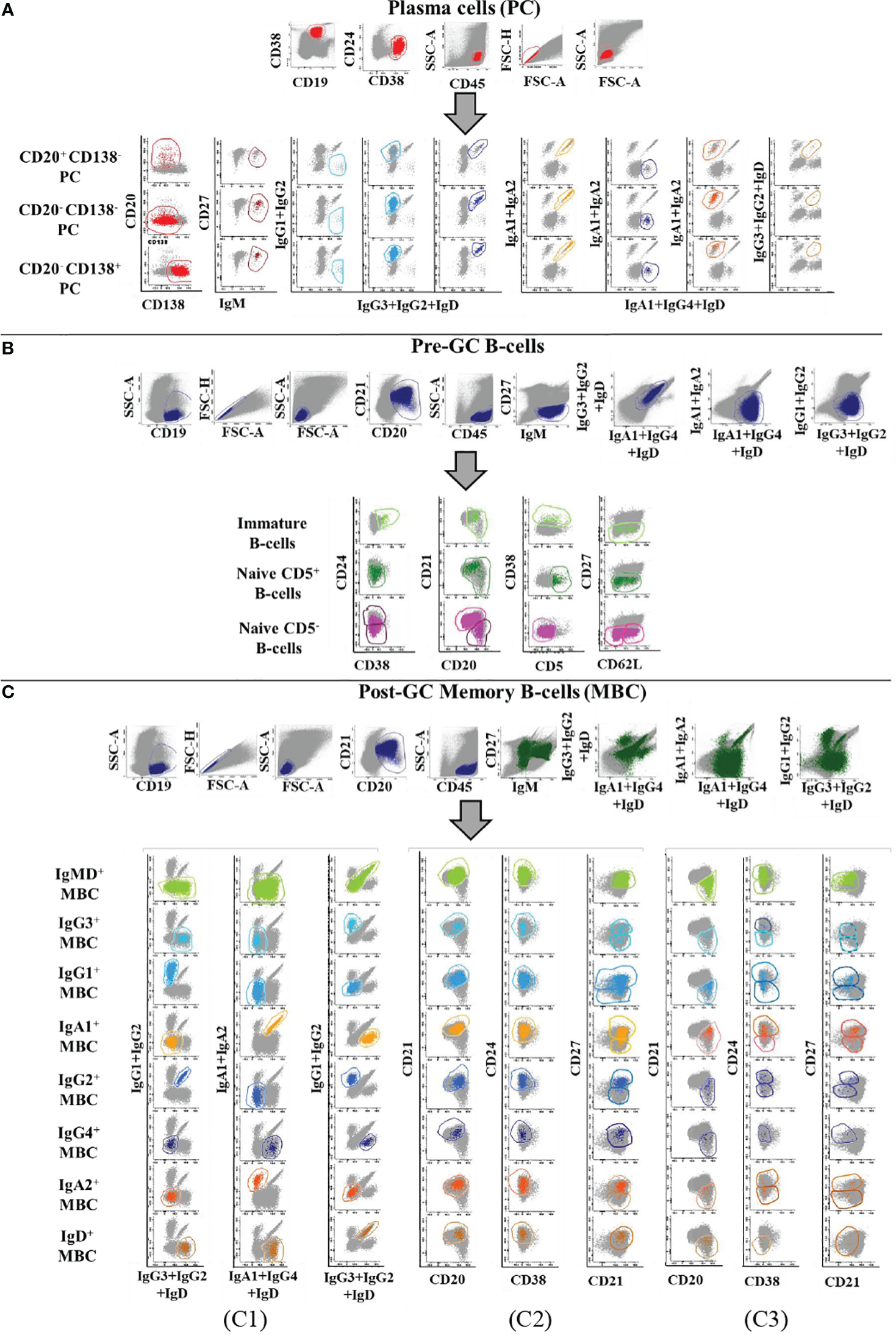 Figure 3 Illustrating example of the Boolean gating strategy used for the identification of the distinct populations of B-lymphocytes and PC circulating in normal human blood upon staining with the Euroflow BIgH-IMM tube, using conventional (manual) gating approaches. B- lymphocytes were defined in (A-C) based on their positivity for CD19, after excluding cell debris and doublets. In turn, PC were identified as those events showing a CD38+ CD24- CD21- CD45+ phenotype, consisting of three maturation-associated subsets (CD20+ CD138-, CD20- CD138- and CD20- CD138+ PC). In (A), each PC subpopulation was classified according to the specific immunoglobulin heavy chain (IgH) isotype and subclass expressed (IgM-D, IgG1-4, IgA1-2, and IgH negative). Within pre-germinal centre (Pre-GC) B-cells, three major subsets of B-lymphocytes were identified: i) immature/transitional B-lymphocytes showing a CD38+ CD24+ CD21het IgMhi IgD+ CD27- CD5lo phenotypic profile; ii) naive CD5+ B-lymphocytes showing a CD38- CD24het CD21+/- IgM+ IgDhi CD27- CD5+ phenotype; and iii) naive CD5- B-lymphocytes showing a CD38- IgM+ IgDhi CD27- CD5- phenotype. Subsequently, naive CD5- B-lymphocytes were subclassified according to the pattern of expression of CD21, CD24 and CD62L (B). Finally, memory B-cells (MBC) were identified as those events showing a CD38- CD20+/++ CD45++ CD5- CD138- phenotype and they were subsequently subdivided according to the IgH+ isotype and subclass expressed (C1); the resulting IgH subsets were further subclassified into CD21+ CD20+ CD27-/+ (C2) and CD21- CD20++ CD24-/+ CD27-/+ MBC subsets (C3).