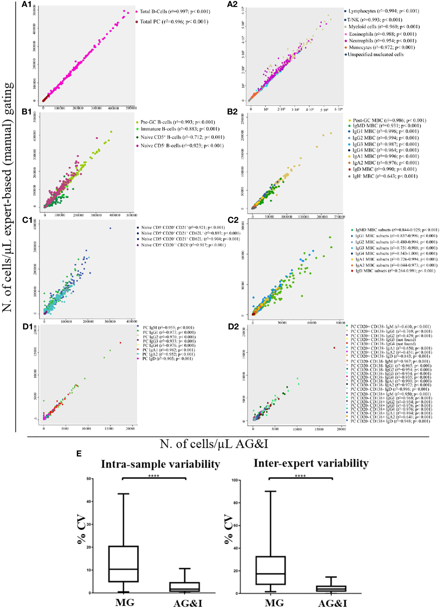 Figure 5 Correlation between the number of events classified as belonging to the different immune cell populations present in normal peripheral blood samples as analysed by expert-based manual gating vs the AGI tool. (A1), total B-lymphocyte cells (r2 = 0.997; p< 0.001) and total PC (r2 = 0.996; p< 0.001); (A2), other major non-B/non-PC leukocyte populations; (B1), major pre-GC B-cell subsets; (B2), major memory B-cell (MBC) subsets; (C1), minor pre-GC B-cell populations; (C2), minor MBC populations; (D1), major PC subsets and (D2), minor PC populations. In (E), intra-assay and inter-expert reproducibility of MG and AGI. Box-and-Whisker plots of CVs (%) for all lymphoid populations. ****Statistically significantly different (p< 0.0001) based on paired t-Test.